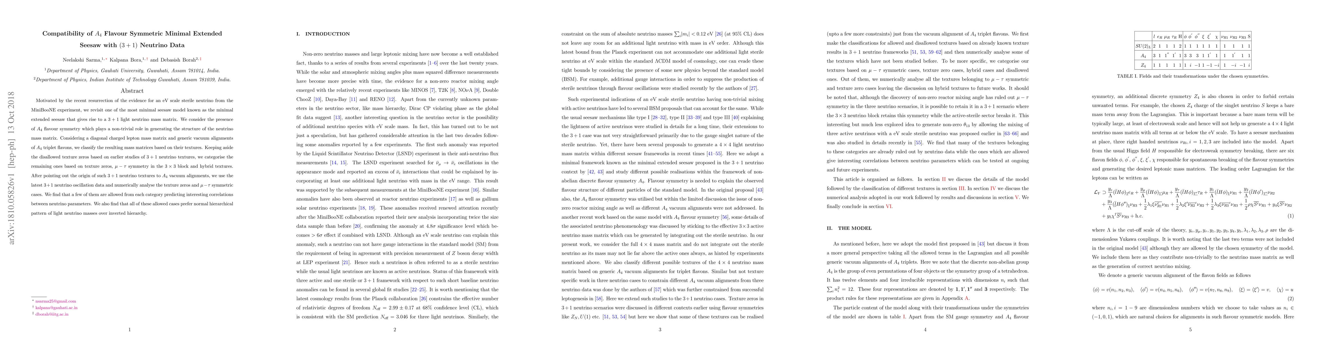 This study revisits a minimal seesaw model with $A_4$ flavour symmetry to explain $(3+1)$ neutrino data, finding correlations between neutrino parameters and preferring normal hierarchical light neutrino masses.