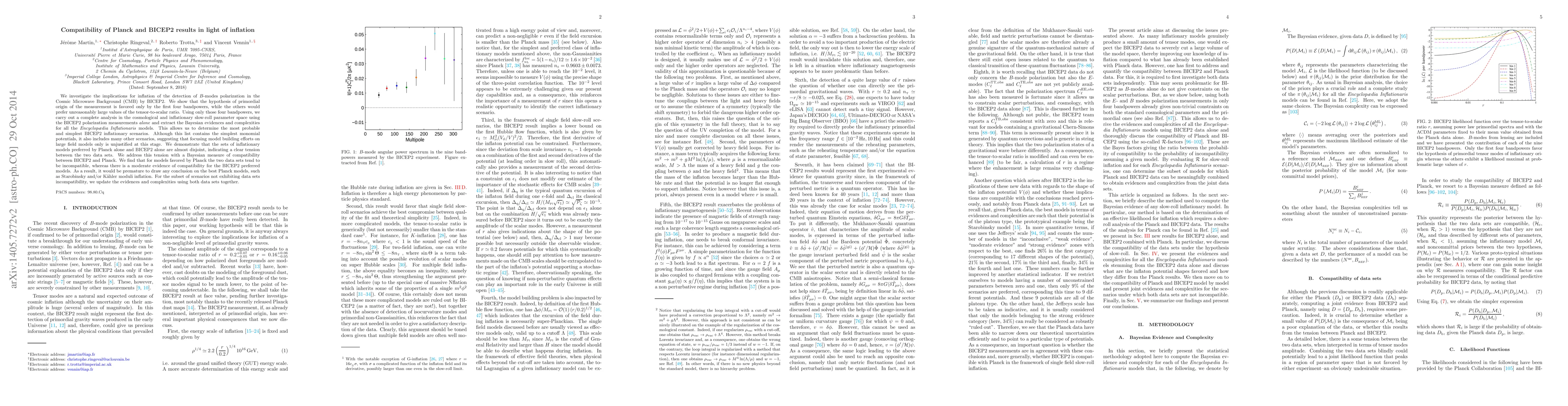 We investigate the implications for inflation of the detection of B-modes polarization in the Cosmic Microwave Background (CMB) by BICEP2. We show that the hypothesis of primordial origin of the measurement is only favored by the first four bandpowers, while the others would prefer unreasonably large values of the tensor-to-scalar ratio. Using only those four bandpowers, we carry out a complete analysis in the cosmological and inflationary slow-roll parameter space using the BICEP2 polarization measurements alone and extract the Bayesian evidences and complexities for all the Encyclopaedia Inflationaris models. This allows us to determine the most probable and simplest BICEP2 inflationary scenarios. Although this list contains the simplest monomial potentials, it also includes many other scenarios, suggesting that focusing model building efforts on large field models only is unjustified at this stage. We demonstrate that the sets of inflationary models preferred by Planck alone and BICEP2 alone are almost disjoint, indicating a clear tension between the two data sets. We address this tension with a Bayesian measure of compatibility between BICEP2 and Planck. We find that for models favored by Planck the two data sets tend to be incompatible, whereas there is a moderate evidence of compatibility for the BICEP2 preferred models. As a result, it would be premature to draw any conclusion on the best Planck models, such as Starobinsky and/or Kahler moduli inflation. For the subset of scenarios not exhibiting data sets incompatibility, we update the evidences and complexities using both data sets together.
