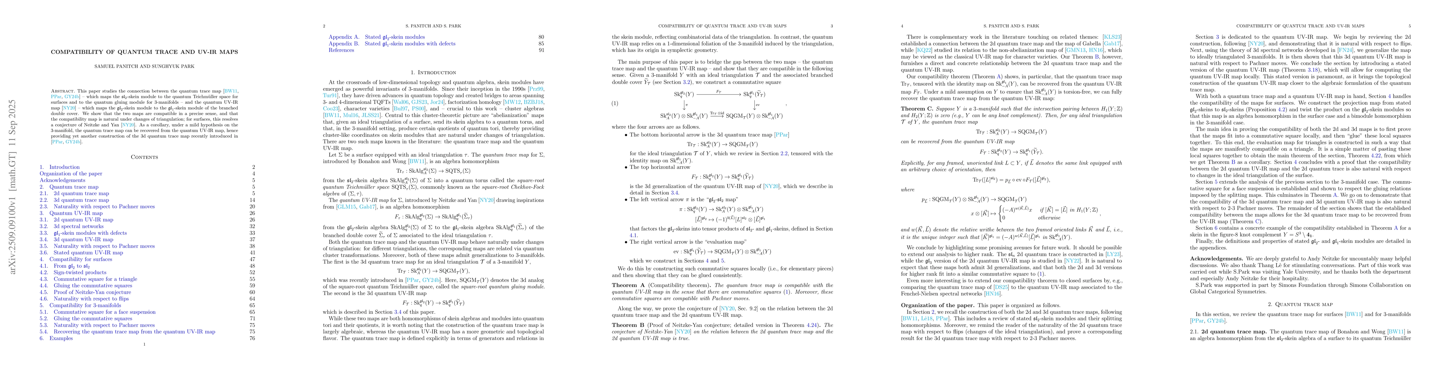 This paper studies the connection between the quantum trace map -- which maps the $\mathfrak{sl}_2$-skein module to the quantum Teichm\"uller space for surfaces and to the quantum gluing module for 3-manifolds -- and the quantum UV-IR map -- which maps the $\mathfrak{gl}_2$-skein module to the $\mathfrak{gl}_1$-skein module of the branched double cover. We show that the two maps are compatible in a precise sense, and that the compatibility map is natural under changes of triangulation; for surfaces, this resolves a conjecture of Neitzke and Yan. As a corollary, under a mild hypothesis on the 3-manifold, the quantum trace map can be recovered from the quantum UV-IR map, hence providing yet another construction of the recently introduced 3d quantum trace map.