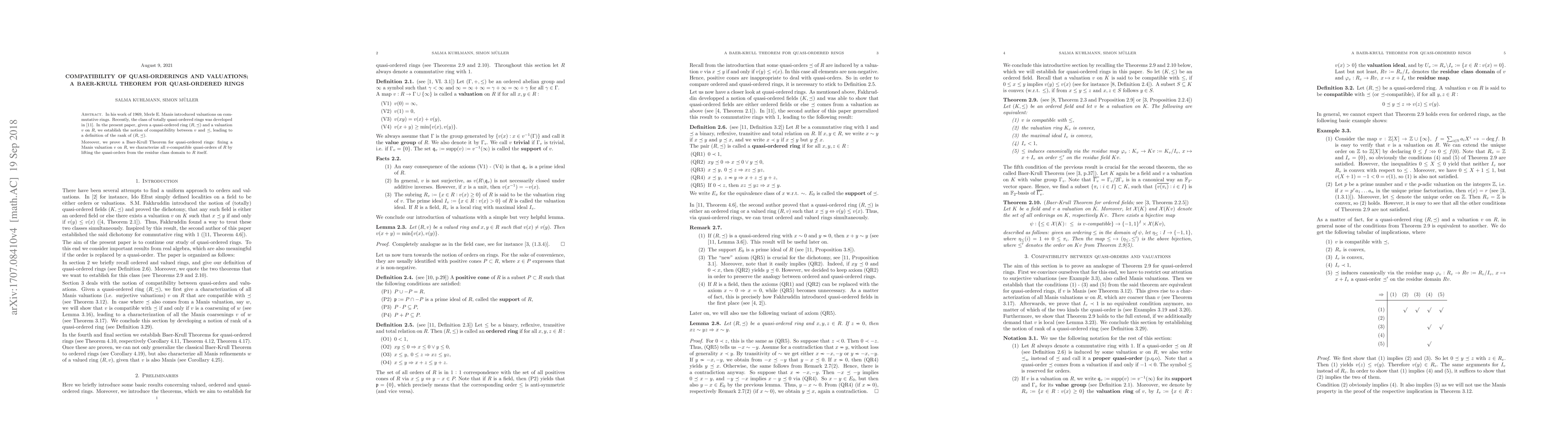 This paper explores the compatibility between valuations and quasi-orders on commutative rings, defining a rank for quasi-ordered rings and proving a Baer-Krull Theorem that characterizes v-compatible quasi-orders by lifting them from the residue class ring.