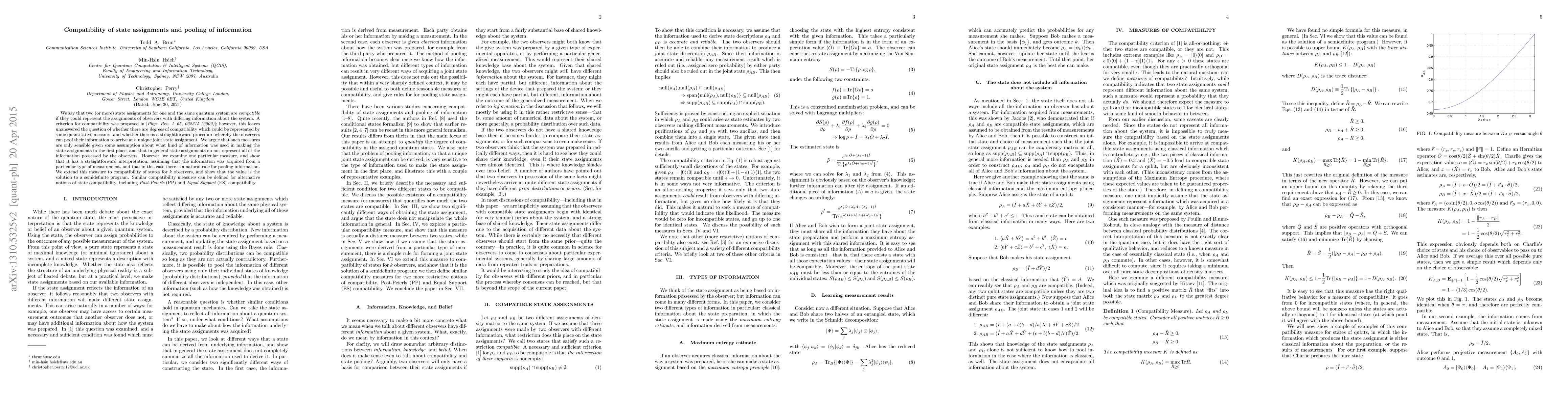 We say that two (or more) state assignments for one and the same quantum system are compatible if they could represent the assignments of observers with differing information about the system. A criterion for compatibility was proposed in [Phys. Rev. A 65, 032315 (2002)]; however, this leaves unanswered the question of whether there are degrees of compatibility which could be represented by some quantitative measure, and whether there is a straightforward procedure whereby the observers can pool their information to arrive at a unique joint state assignment. We argue that such measures are only sensible given some assumption about what kind of information was used in making the state assignments in the first place, and that in general state assignments do not represent all of the information possessed by the observers. However, we examine one particular measure, and show that it has a straightforward interpretation, assuming that the information was acquired from a particular type of measurement, and that in this case there is a natural rule for pooling information. We extend this measure to compatibility of states for k observers, and show that the value is the solution to a semidefinite program. Similar compatibility measures can be defined for alternative notions of state compatibility, including Post-Peierls (PP) and Equal Support (ES) compatibility.
