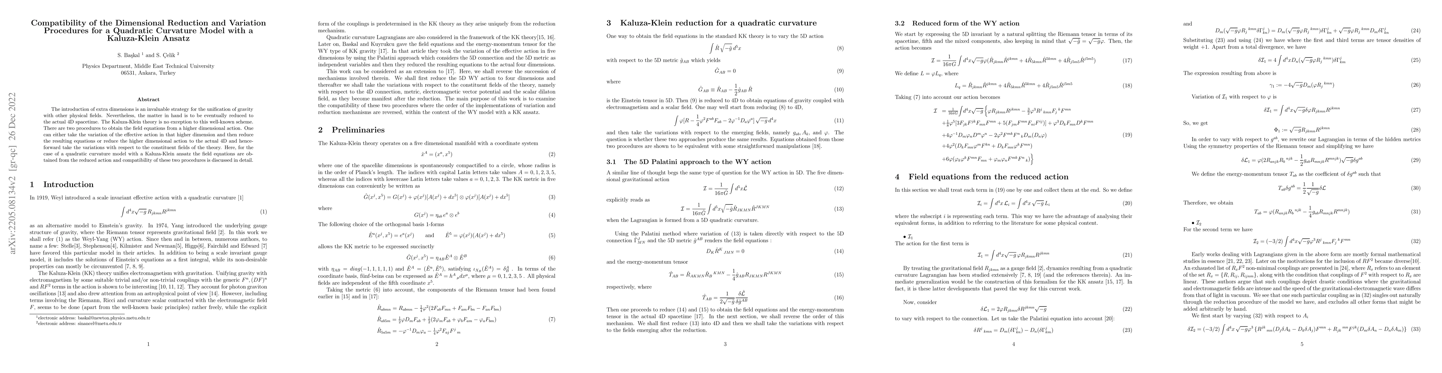 The introduction of extra dimensions is an invaluable strategy for the unification of gravity with other physical fields. Nevertheless, the matter in hand is to be eventually reduced to the actual 4D spacetime. The Kaluza-Klein theory is no exception to this well-known scheme. There are two procedures to obtain the field equations from a higher dimensional action. One can either take the variation of the effective action in that higher dimension and then reduce the resulting equations or reduce the higher dimensional action to the actual 4D and henceforward take the variations with respect to the constituent fields of the theory. Here, for the case of a quadratic curvature model with a Kaluza-Klein ansatz the field equations are obtained from the reduced action and compatibility of these two procedures is discussed in detail.