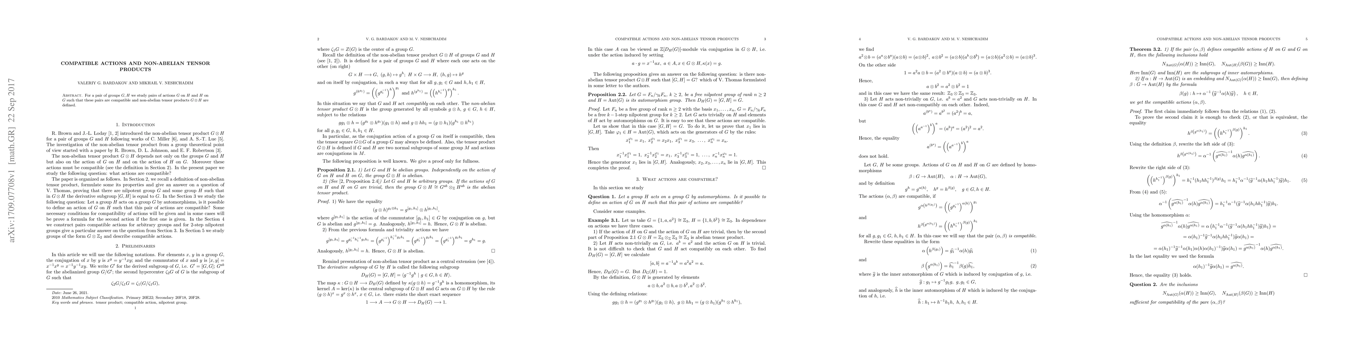This paper explores compatible actions between two groups $G$ and $H$, focusing on scenarios where non-abelian tensor products $G \otimes H$ can be defined. It examines the structure and implications of these compatible actions.