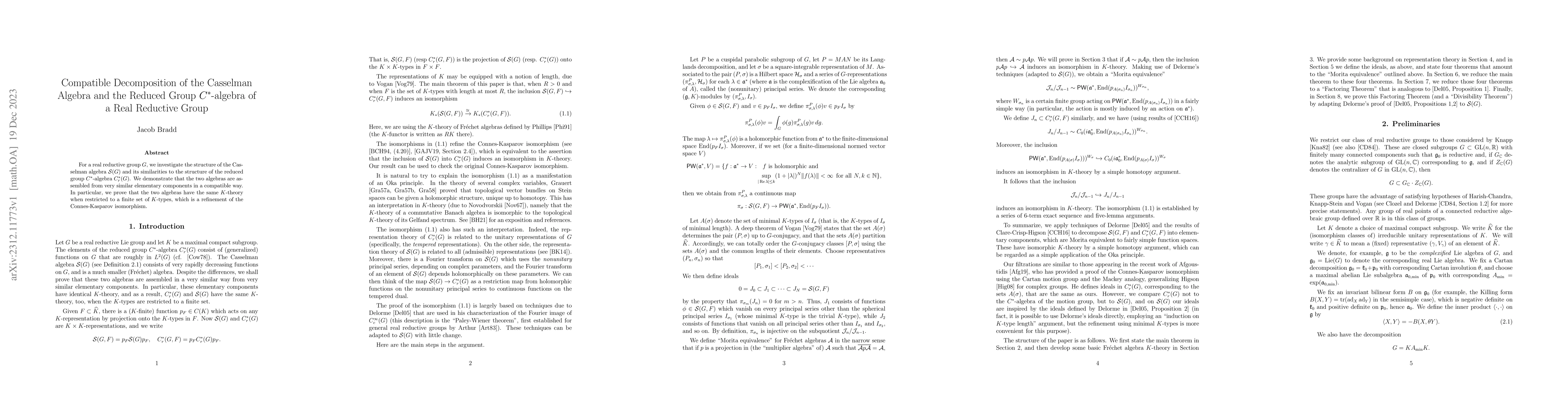 This research demonstrates a compatible decomposition of the Casselman algebra $\mathcal{S}(G)$ and the reduced group $C^*$-algebra $C_r^*(G)$ for a real reductive group $G$, showing they share similar elementary components and have the same $K$-theory for a finite set of $K$-types, enhancing the Connes-Kasparov isomorphism.
