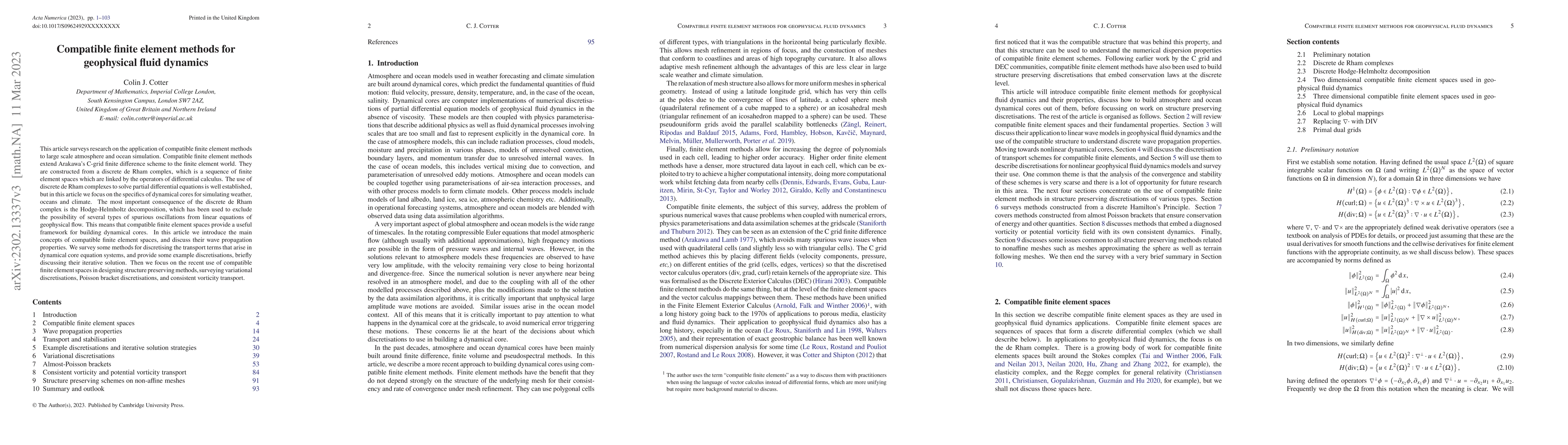 This article surveys the application of compatible finite element methods to simulate large-scale atmospheric and oceanic dynamics, emphasizing their ability to prevent spurious oscillations through the Hodge-Helmholtz decomposition and their use in constructing structure-preserving dynamical cores. It also discusses discretization methods for transport terms and recent developments in variational and Poisson bracket discretizations.