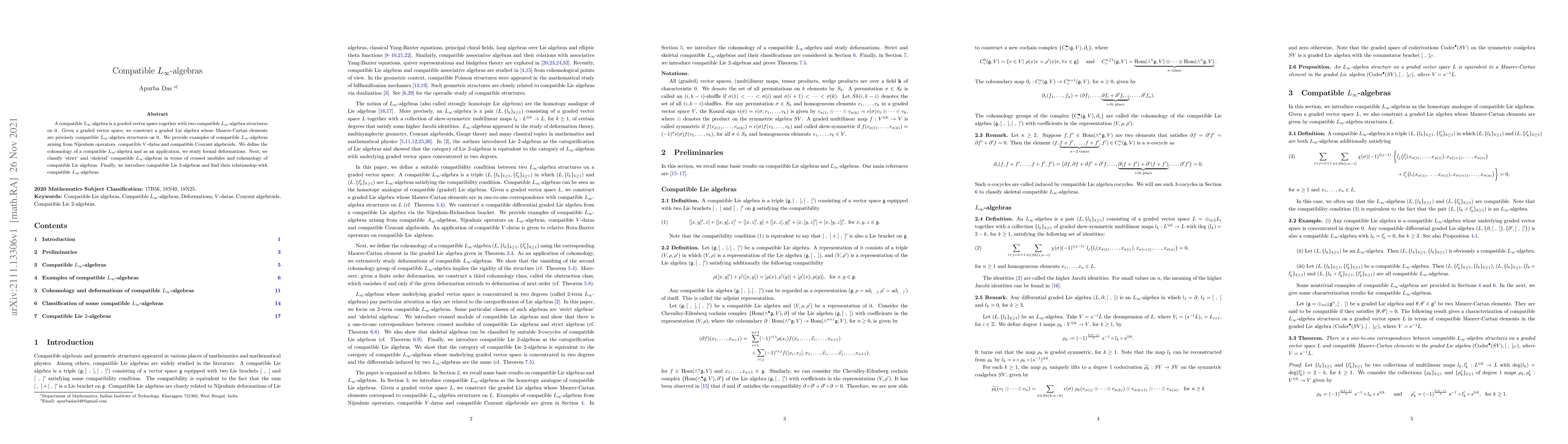 This paper explores the concept of compatible $L_\infty$-algebras, which are graded vector spaces with two compatible $L_\infty$-algebra structures. It constructs a graded Lie algebra relating to these structures and studies their examples, cohomology, and formal deformations, ultimately classifying specific types and linking them to compatible Lie $2$-algebras.