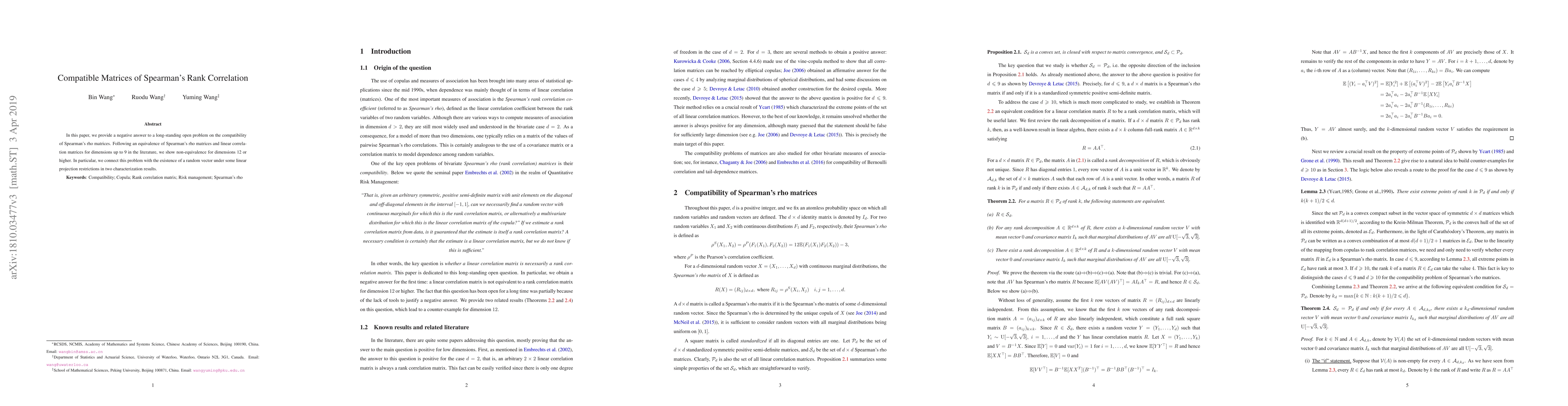 This paper refutes the long-standing conjecture that Spearman's rho matrices are equivalent to linear correlation matrices for dimensions 12 or higher, demonstrating non-equivalence through two characterization results involving random vectors under linear projection restrictions.