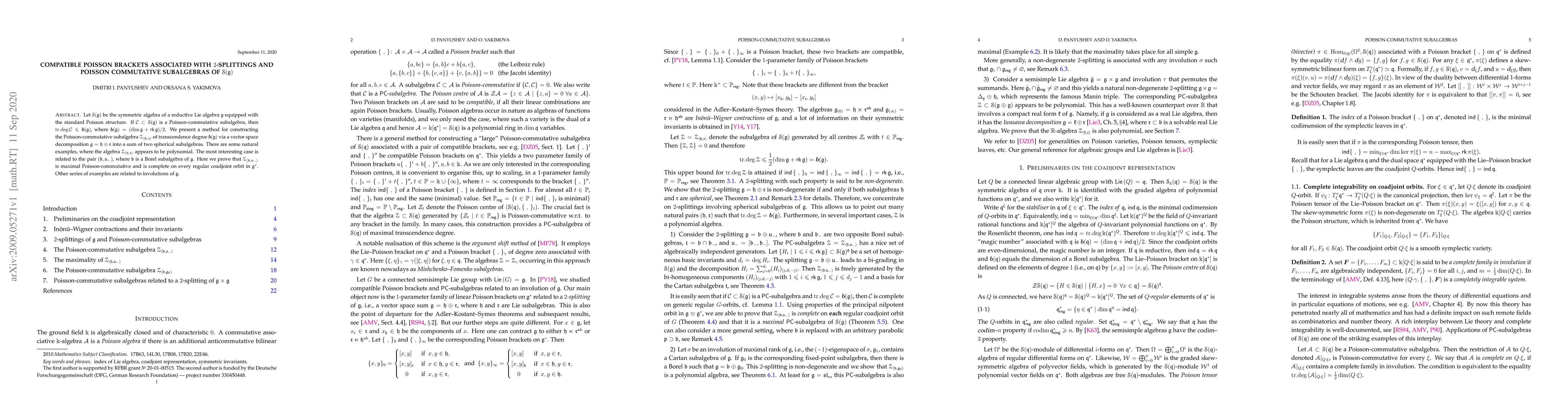 Let ${\mathcal S}(\mathfrak g)$ be the symmetric algebra of a reductive Lie algebra $\mathfrak g$ equipped with the standard Poisson structure. If ${\mathcal C}\subset\mathcal S(\mathfrak g)$ is a Poisson-commutative subalgebra, then ${\rm trdeg\,}{\mathcal C}\le\boldsymbol{b}(\mathfrak g)$, where $\boldsymbol{b}(\mathfrak g)=(\dim\mathfrak g+{\rm rk}\mathfrak g)/2$. We present a method for constructing the Poisson-commutative subalgebra $\mathcal Z_{\langle\mathfrak h,\mathfrak r\rangle}$ of transcendence degree $\boldsymbol{b}(\mathfrak g)$ via a vector space decomposition $\mathfrak g=\mathfrak h\oplus\mathfrak r$ into a sum of two spherical subalgebras. There are some natural examples, where the algebra $\mathcal Z_{\langle\mathfrak h,\mathfrak r\rangle}$ appears to be polynomial. The most interesting case is related to the pair $(\mathfrak b,\mathfrak u_-)$, where $\mathfrak b$ is a Borel subalgebra of $\mathfrak g$. Here we prove that ${\mathcal Z}_{\langle\mathbb b,\mathbb u_-\rangle}$ is maximal Poisson-commutative and is complete on every regular coadjoint orbit in $\mathfrak g^*$. Other series of examples are related to decompositions associated with involutions of $\mathfrak g$.
