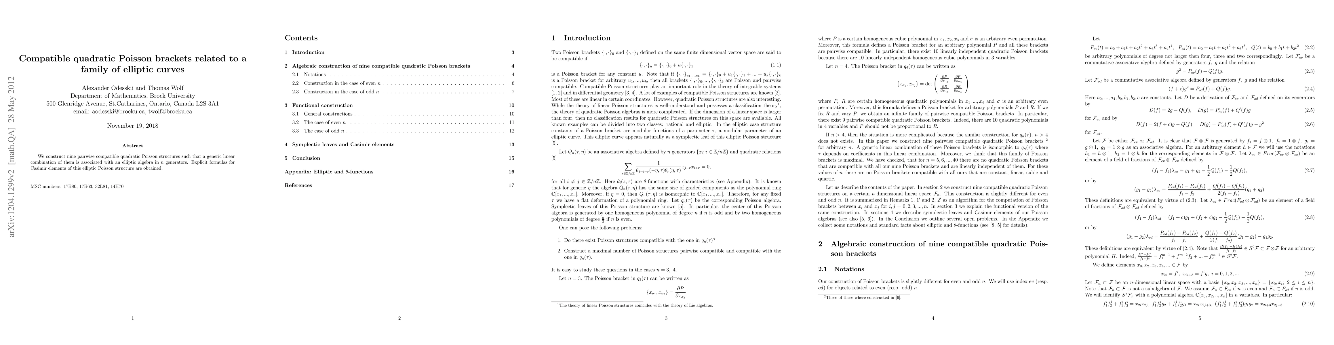The paper constructs nine compatible quadratic Poisson structures linked to a family of elliptic curves, with a linear combination of these structures associated with an elliptic algebra in n generators, and provides explicit formulas for the Casimir elements of this structure.
