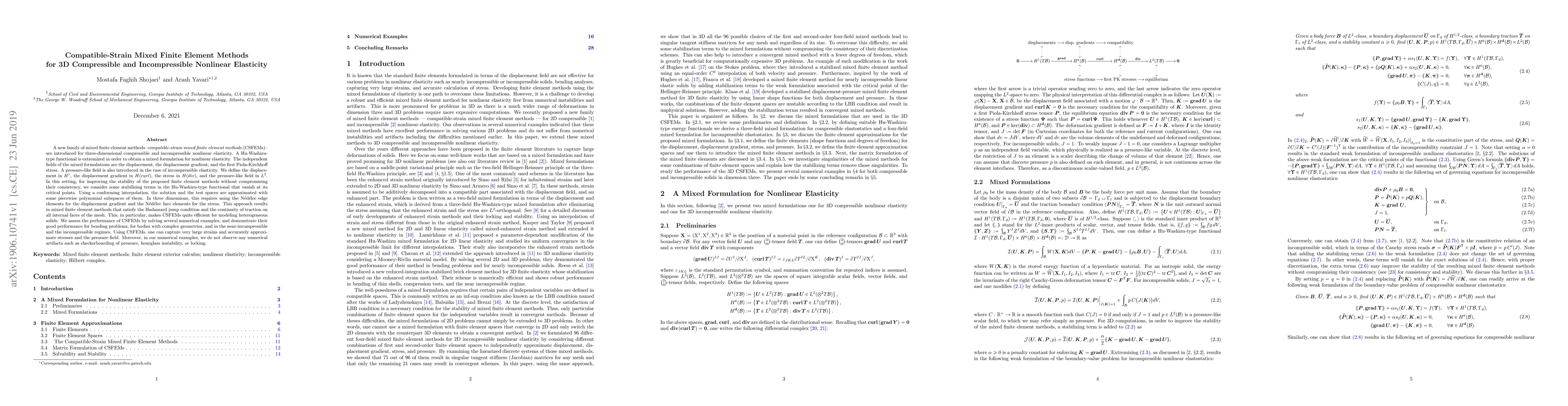 This paper introduces compatible-strain mixed finite element methods (CSFEMs) for modeling three-dimensional compressible and incompressible nonlinear elasticity. The methods stabilize the formulation without sacrificing consistency, and demonstrate good performance in numerical simulations for complex geometries and large strains.