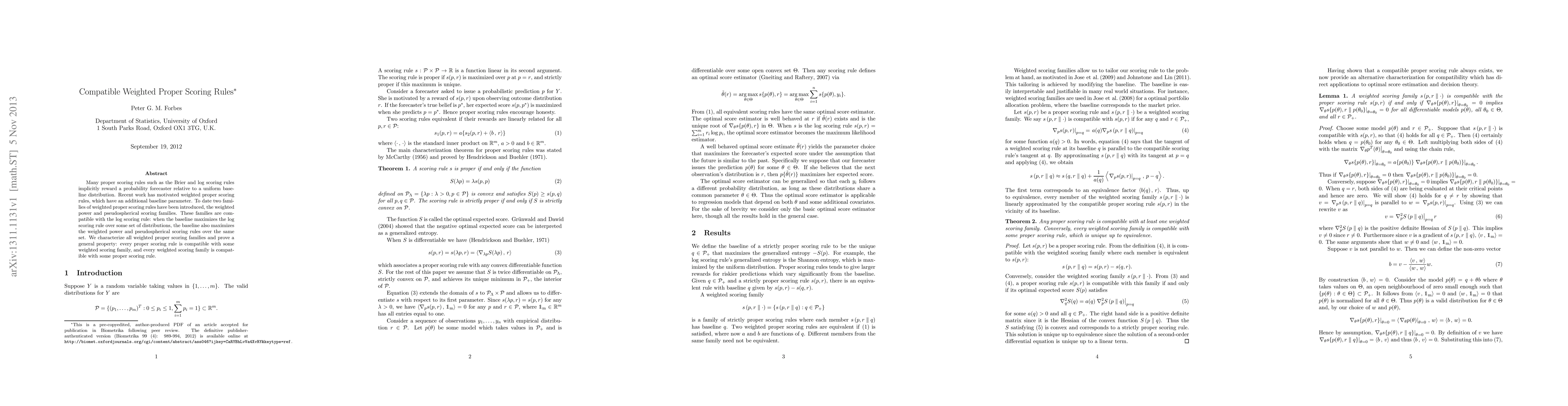 This paper explores the compatibility of weighted proper scoring rules, showing that weighted power and pseudospherical scoring families are compatible with the log scoring rule. It proves that every proper scoring rule can be paired with a compatible weighted scoring family, and vice versa.