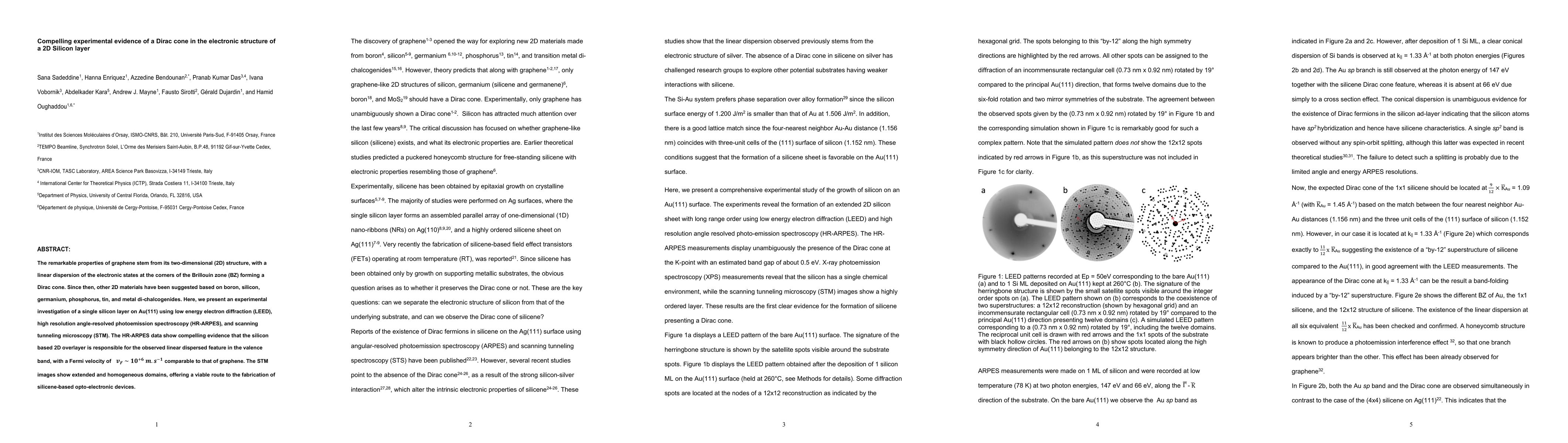 The remarkable properties of graphene stem from its two-dimensional (2D) structure, with a linear dispersion of the electronic states at the corners of the Brillouin zone (BZ) forming a Dirac cone. Since then, other 2D materials have been suggested based on boron, silicon, germanium, phosphorus, tin, and metal di-chalcogenides. Here, we present an experimental investigation of a single silicon layer on Au(111) using low energy electron diffraction (LEED), high resolution angle-resolved photoemission spectroscopy (HR-ARPES), and scanning tunneling microscopy (STM). The HR-ARPES data show compelling evidence that the silicon based 2D overlayer is responsible for the observed linear dispersed feature in the valence band, with a Fermi velocity of v_F ~10^(+6) m.s^(-1) comparable to that of graphene. The STM images show extended and homogeneous domains, offering a viable route to the fabrication of silicene-based opto-electronic devices.