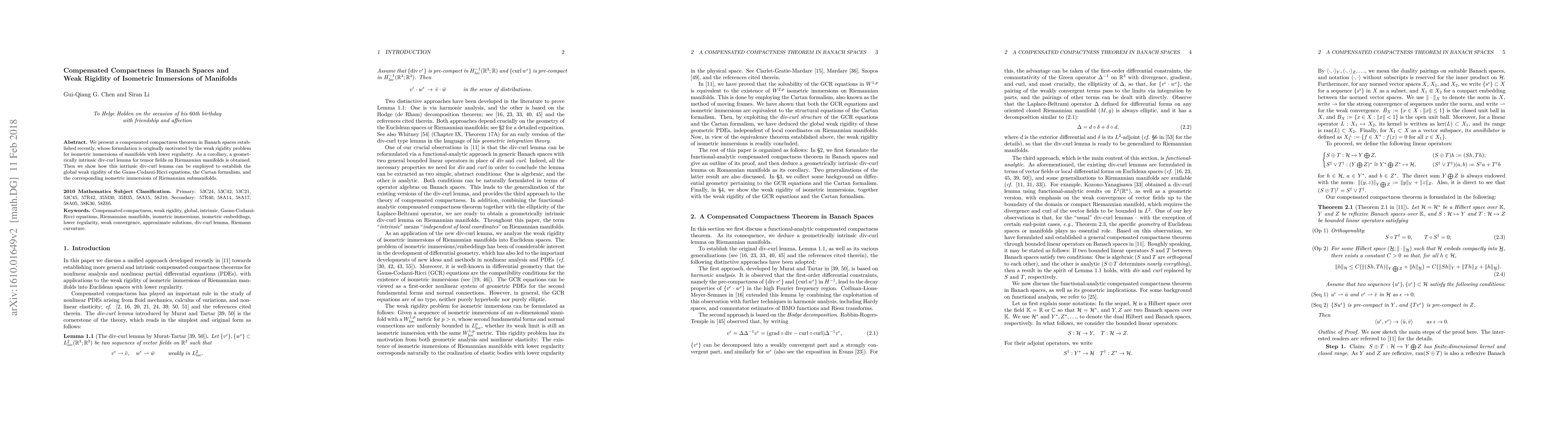 This paper establishes a compensated compactness theorem in Banach spaces, motivated by the weak rigidity problem for isometric immersions of manifolds. It derives a div-curl lemma for tensor fields and uses it to prove the global weak rigidity of Gauss-Codazzi-Ricci equations and related immersions.