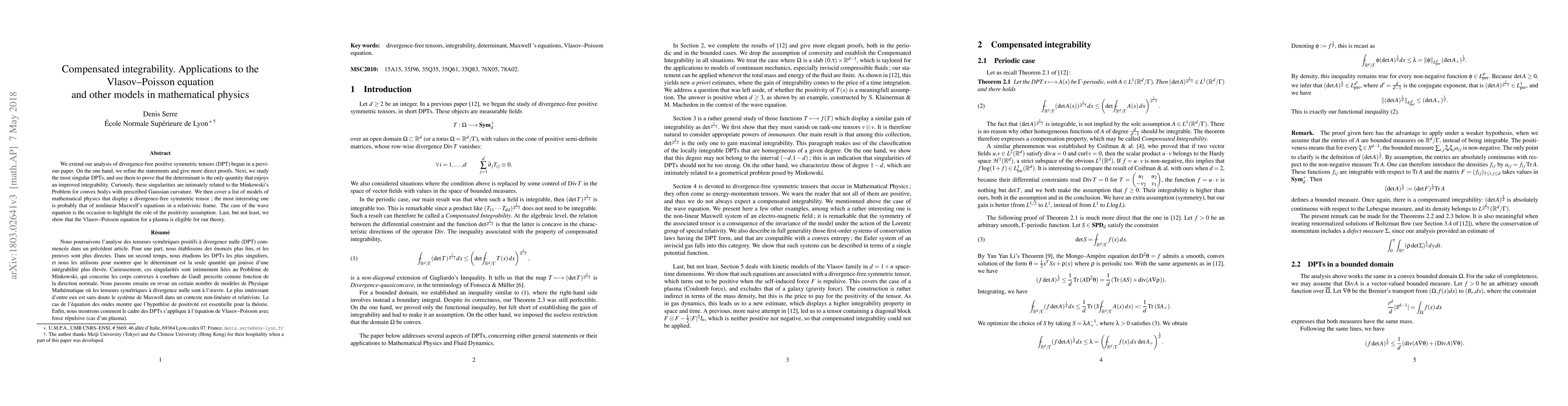 We extend our analysis of divergence-free positive symmetric tensors (DPT) begun in a previous paper. On the one hand, we refine the statements and give more direct proofs. Next, we study the most singular DPTs, and use them to prove that the determinant is the only quantity that enjoys an improved integrability. Curiously, these singularities are intimately related to the Minkowski's Problem for convex bodys with prescribed Gaussian curvature. We then cover a list of models of mathematical physics that display a divergence-free symmetric tensor ; the most interesting one is probably that of nonlinear Maxwell's equations in a relativistic frame. The case of the wave equation is the occasion to highlight the role of the positivity assumption. Last, but not least, we show that the Vlasov--Poisson equation for a plasma is eligible for our theory.
