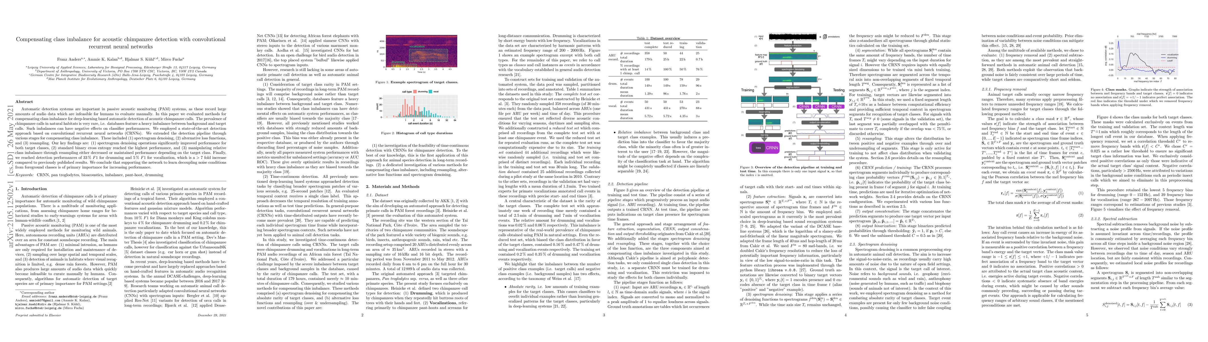 This paper investigates methods to address class imbalance in detecting acoustic chimpanzee calls using convolutional recurrent neural networks (CRNNs). The study found that spectrogram denoising significantly improved detection performance, while standard binary cross entropy yielded the best results. Resampling had mixed effects on performance based on the target class. The proposed approach achieved a notable >7-fold increase in detection performance compared to previous methods.