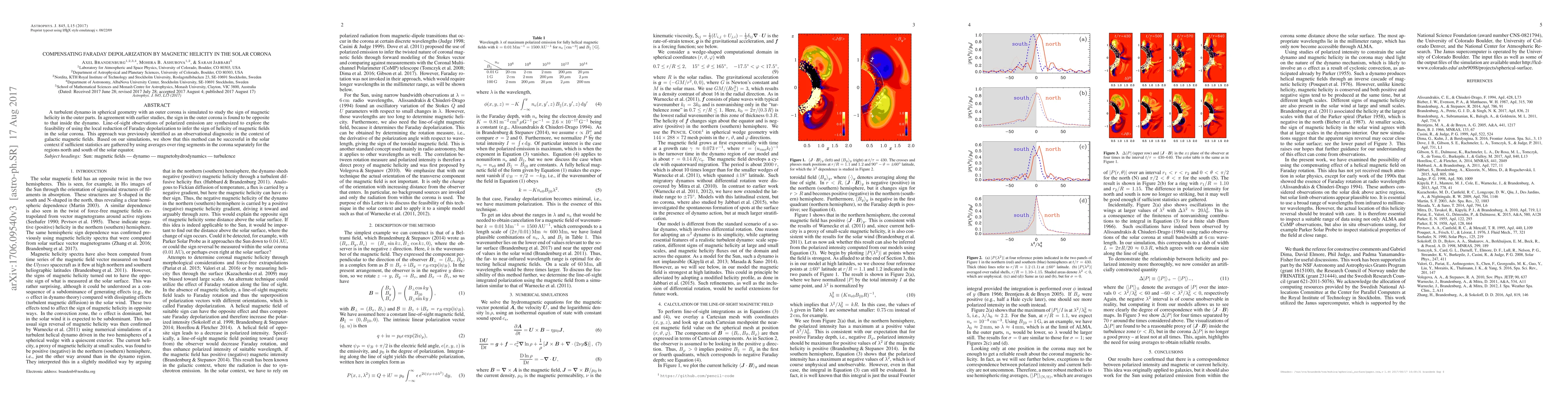 A turbulent dynamo in spherical geometry with an outer corona is simulated to study the sign of magnetic helicity in the outer parts. In agreement with earlier studies, the sign in the outer corona is found to be opposite to that inside the dynamo. Line-of-sight observations of polarized emission are synthesized to explore the feasibility of using the local reduction of Faraday depolarization to infer the sign of helicity of magnetic fields in the solar corona. This approach was previously identified as an observational diagnostic in the context of galactic magnetic fields. Based on our simulations, we show that this method can be successful in the solar context if sufficient statistics is gathered by using averages over ring segments in the corona separately for the regions north and south of the solar equator.
