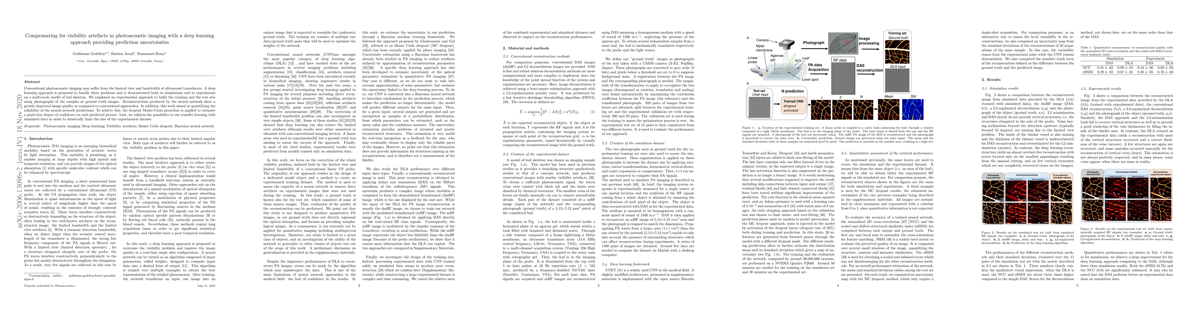 Conventional photoacoustic imaging may suffer from the limited view and bandwidth of ultrasound transducers. A deep learning approach is proposed to handle these problems and is demonstrated both in simulations and in experiments on a multi-scale model of leaf skeleton. We employed an experimental approach to build the training and the test sets using photographs of the samples as ground truth images. Reconstructions produced by the neural network show a greatly improved image quality as compared to conventional approaches. In addition, this work aimed at quantifying the reliability of the neural network predictions. To achieve this, the dropout Monte-Carlo procedure is applied to estimate a pixel-wise degree of confidence on each predicted picture. Last, we address the possibility to use transfer learning with simulated data in order to drastically limit the size of the experimental dataset.