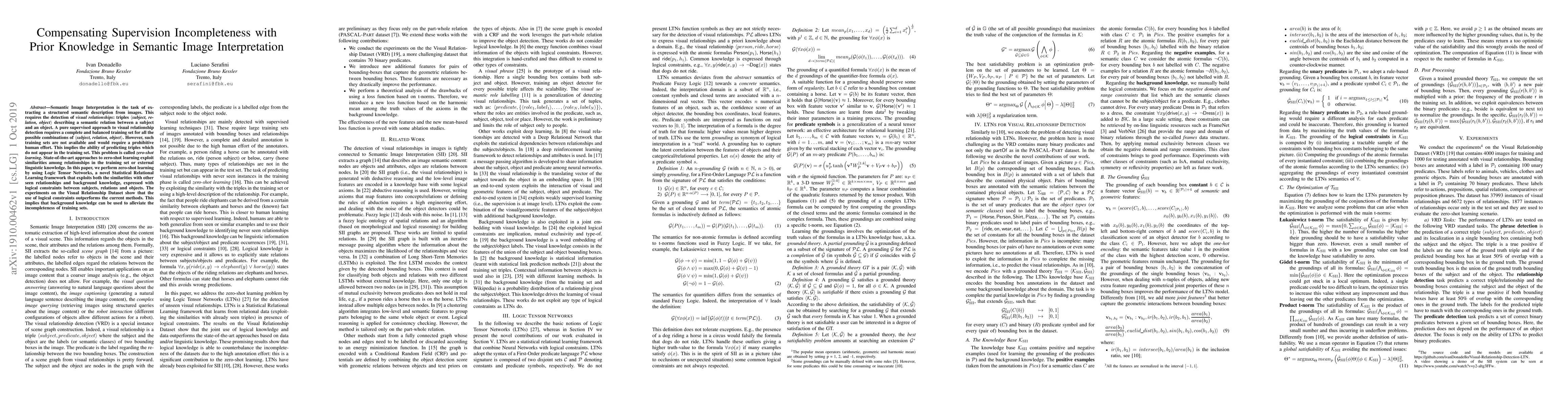 Semantic Image Interpretation is the task of extracting a structured semantic description from images. This requires the detection of visual relationships: triples (subject,relation,object) describing a semantic relation between a subject and an object. A pure supervised approach to visual relationship detection requires a complete and balanced training set for all the possible combinations of (subject, relation, object). However, such training sets are not available and would require a prohibitive human effort. This implies the ability of predicting triples which do not appear in the training set. This problem is called zero-shot learning. State-of-the-art approaches to zero-shot learning exploit similarities among relationships in the training set or external linguistic knowledge. In this paper, we perform zero-shot learning by using Logic Tensor Networks, a novel Statistical Relational Learning framework that exploits both the similarities with other seen relationships and background knowledge, expressed with logical constraints between subjects, relations and objects. The experiments on the Visual Relationship Dataset show that the use of logical constraints outperforms the current methods. This implies that background knowledge can be used to alleviate the incompleteness of training sets.