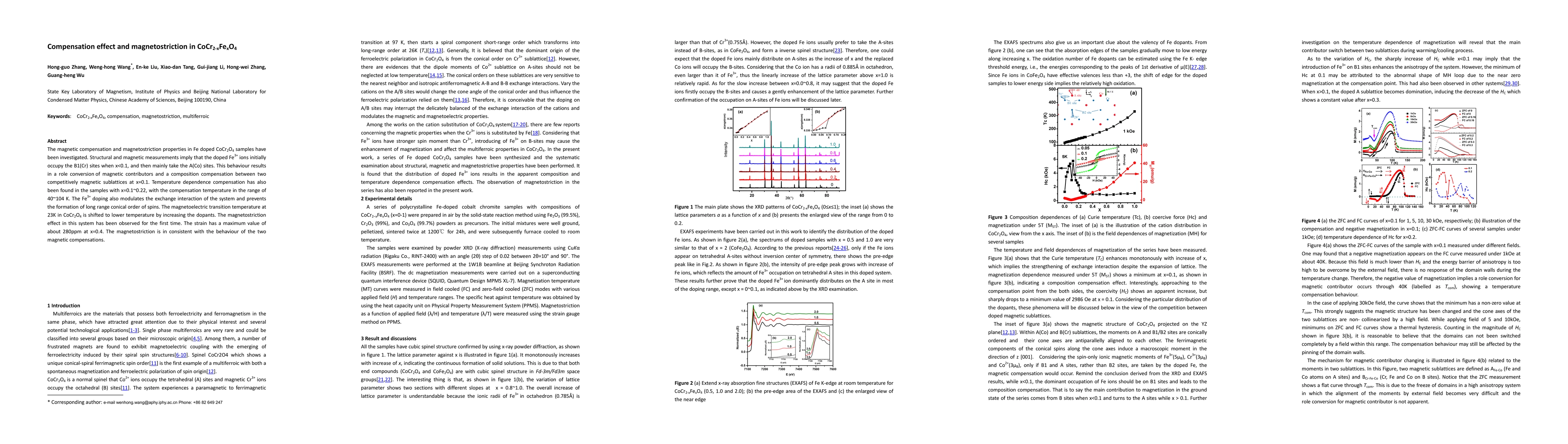 The magnetic compensation and magnetostriction properties in Fe doped CoCr2O4 samples have been investigated. Structural and magnetic measurements imply that the doped Fe3+ ions initially occupy the B1(Cr) sites when x<0.1, and then mainly take the A(Co) sites. This behaviour results in a role conversion of magnetic contributors and a composition compensation between two competitively magnetic sublattices at x=0.1. Temperature dependence compensation has also been found in the samples with x=0.1~0.22, with the compensation temperature in the range of 40~104 K. The Fe3+ doping also modulates the exchange interaction of the system and prevents the formation of long range conical order of spins. The magnetoelectric transition temperature at 23K in CoCr2O4 is shifted to lower temperature by increasing the dopants. The magnetostriction effect in this system has been observed for the first time. The strain has a maximum value of about 280ppm at x=0.4. The magnetostriction is in consistent with the behaviour of the two magnetic compensations.