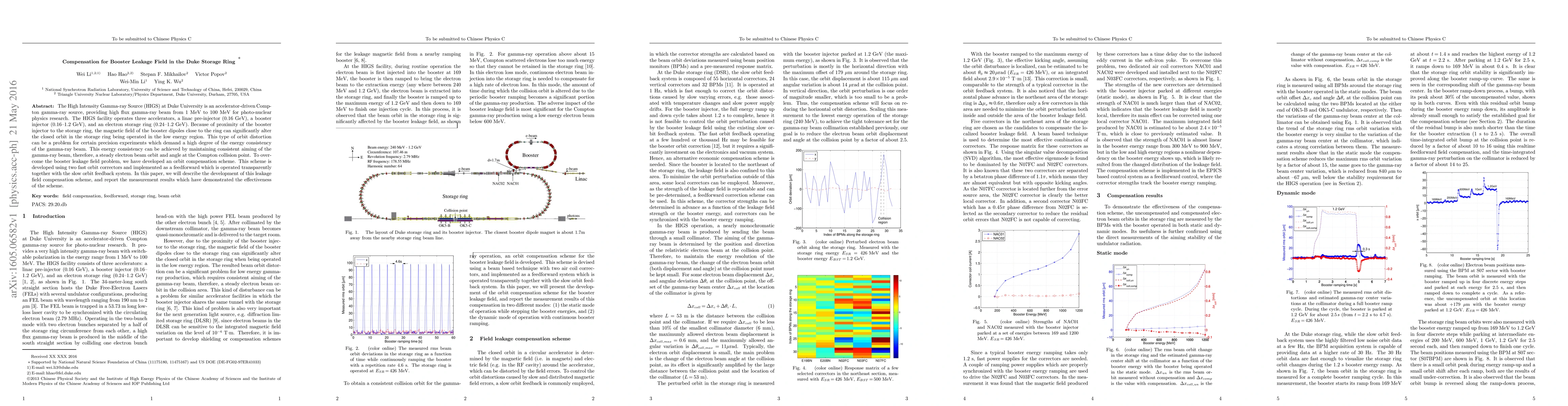 This paper details the development of a compensation scheme to correct for booster leakage field-induced orbit distortions in the Duke Storage Ring, using fast orbit correctors in a feedforward system alongside a slow feedback system. The scheme effectively maintains the necessary beam energy consistency for precision photo-nuclear physics experiments.