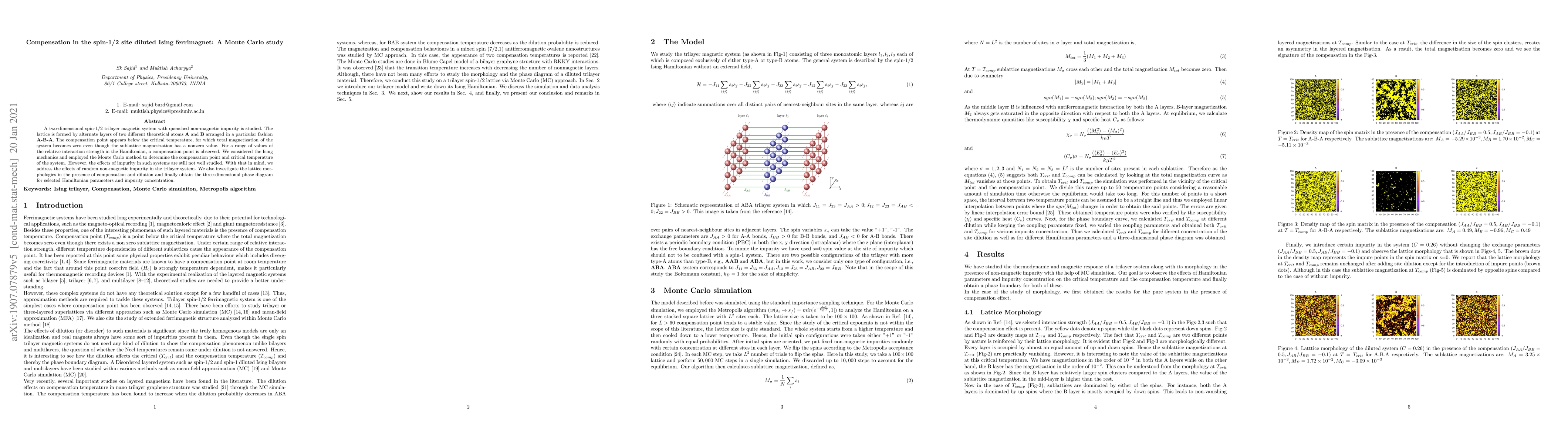 A two-dimensional spin-1/2 trilayer magnetic system with quenched non-magnetic impurity is studied. The lattice is formed by alternate layers of two different theoretical atoms A and B arranged in a particular fashion A-B-A. The compensation point appears below the critical temperature, for which total magnetization of the system becomes zero even though the sublattice magnetization has a nonzero value. For a range of values of the relative interaction strength in the Hamiltonian, a compensation point is observed. We considered the Ising mechanics and employed the Monte Carlo method to determine the compensation point and critical temperature of the system. However, the effects of impurity in such systems are still not well studied. With that in mind, we address the effects of random non-magnetic impurity in the trilayer system. We also investigate the lattice morphologies in the presence of compensation and dilution and finally obtain the three-dimensional phase diagram for selected Hamiltonian parameters and impurity concentration.