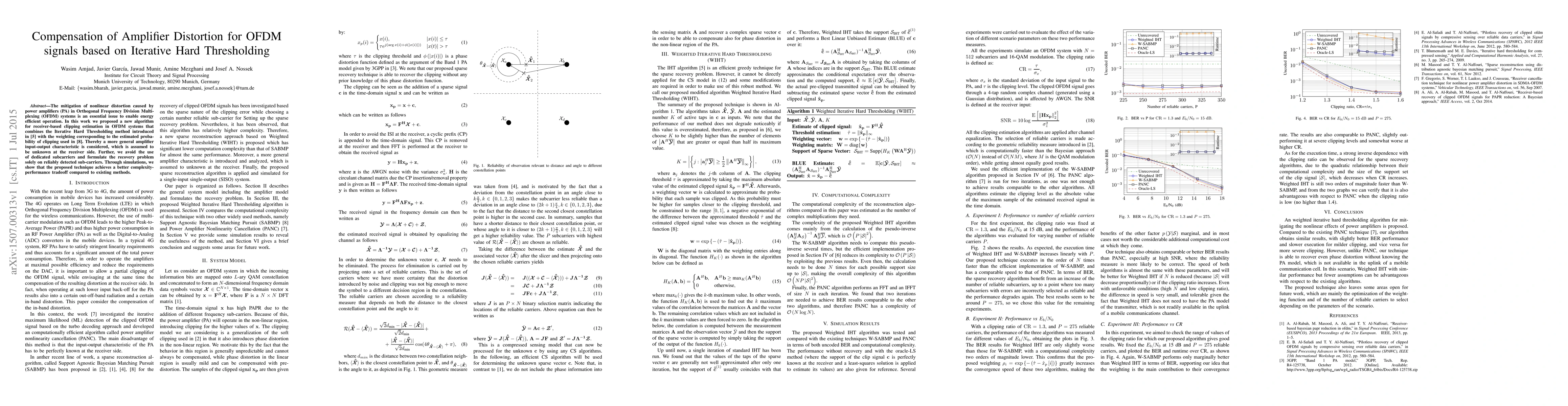 This research introduces a new receiver-based algorithm using Iterative Hard Thresholding (IHT) to counteract amplifier distortion in OFDM systems. The method effectively manages unknown amplifier characteristics and outperforms existing techniques in terms of complexity-performance tradeoff, avoiding dedicated subcarriers and focusing on reliably detected sub-carriers for recovery.
