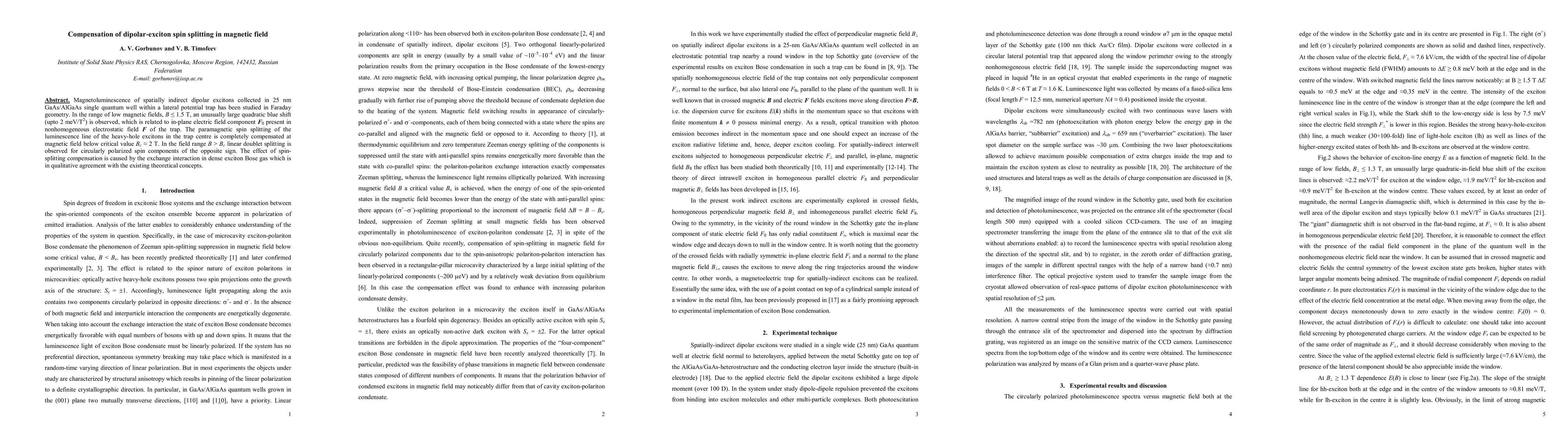 Magnetoluminescence of spatially indirect dipolar excitons collected in 25 nm GaAs/AlGaAs single quantum well within a lateral potential trap has been studied in perpendicular magnetic field in Faraday geometry. The paramagnetic spin splitting of the luminescence line of the heavy-hole excitons in the trap centre is completely compensated at magnetic fields below critical value, around 2 Tesla. The effect of spin-splitting compensation is caused by the exchange interaction in dense exciton Bose gas which is in qualitative agreement with the existing theoretical concepts. In the range of low magnetic fields, less than 1.5 Tesla, an unusually large blue shift, upto 3 meV, is observed, which is related to in-plane electric field component present in nonhomogeneous electrostatic field of the trap.
