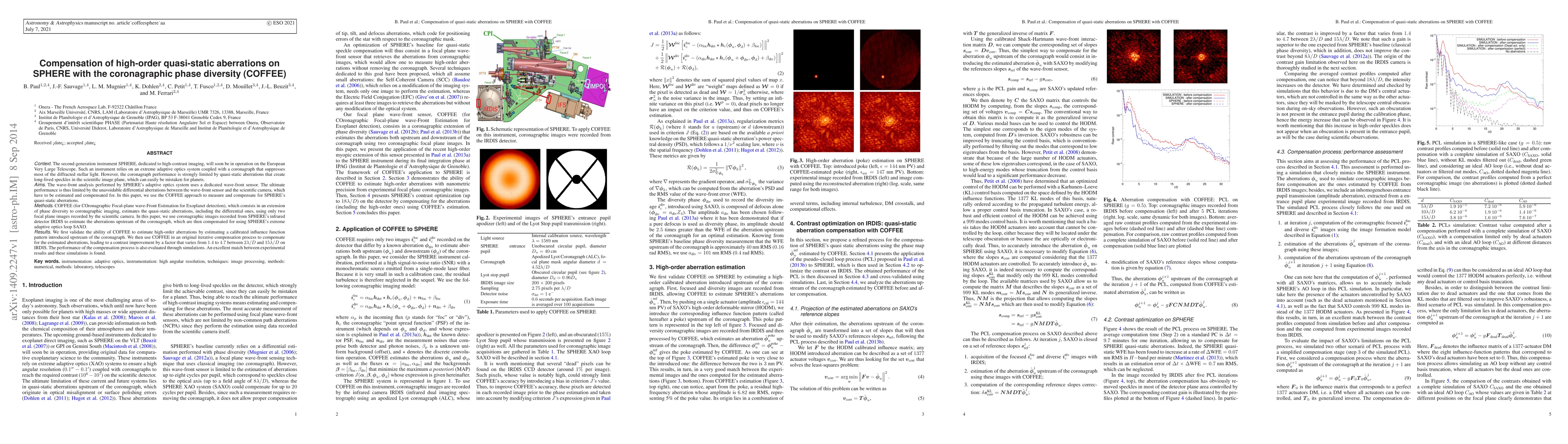 This paper details the use of the COFFEE approach to measure and compensate for high-order quasi-static aberrations in SPHERE's adaptive optics system, leading to significant contrast improvements in high-contrast imaging. The COFFEE method, an extension of phase diversity, estimates and corrects these aberrations using two focal plane images, achieving a contrast enhancement factor of 1.4 to 4.7.