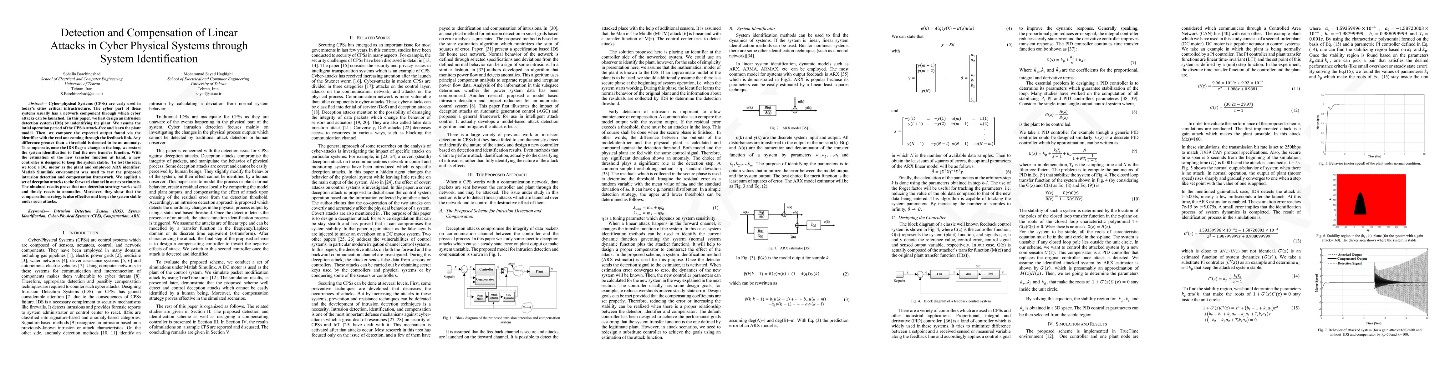 This paper proposes an intrusion detection system for Cyber-Physical Systems (CPSs) using ARX system identification to detect and compensate for linear attacks. The method effectively identifies anomalies and adapts the control system to maintain stability under attack.