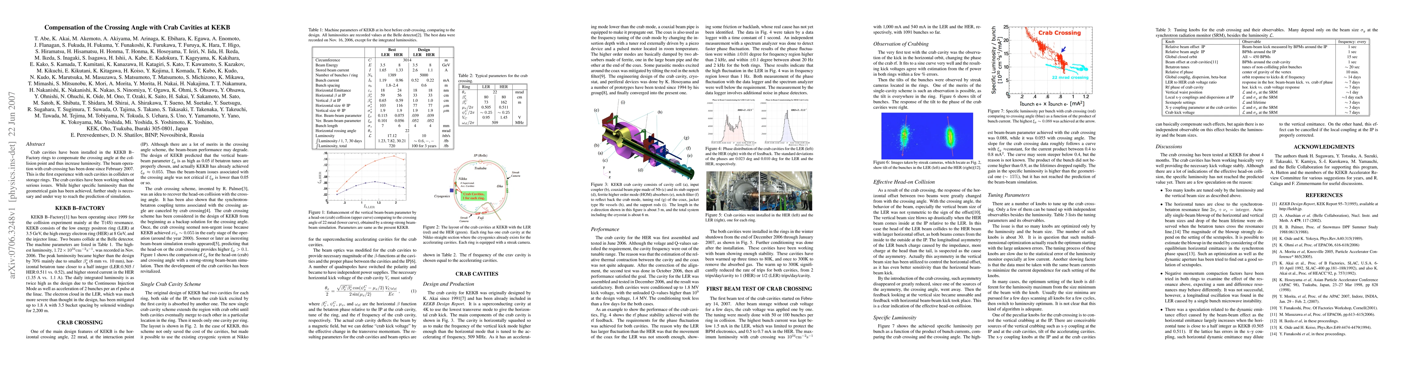 Crab cavities were installed in KEKB to compensate the crossing angle, enhancing luminosity since February 2007. Although initial results show higher specific luminosity than expected, ongoing studies aim to meet simulation predictions.