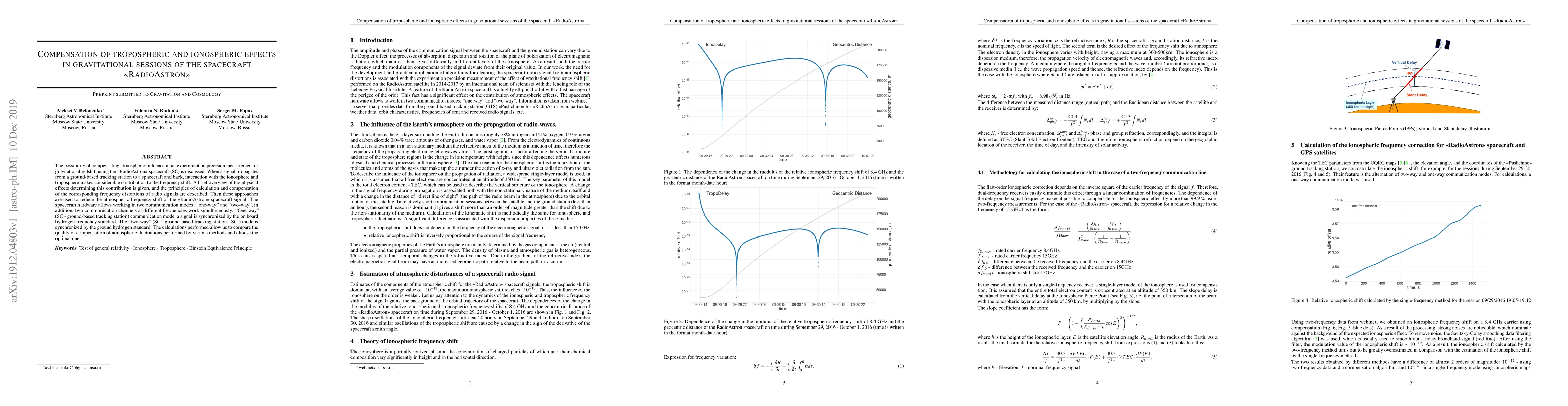 The possibility of compensating atmospheric influence in an experiment on precision measurement of gravitational redshift using the "RadioAstron" spacecraft (SC) is discussed. When a signal propagates from a ground-based tracking station to a spacecraft and back, interaction with the ionosphere and troposphere makes considerable contribution to the frequency shift. A brief overview of the physical effects determining this contribution is given, and the principles of calculation and compensation of the corresponding frequency distortions of radio signals are described. Then these approaches are used to reduce the atmospheric frequency shift of the "RadioAstron" spacecraft signal. The spacecraft hardware allows working in two communication modes: "one-way" and "two-way", in addition, two communication channels at different frequencies work simultaneously. "One-way" (SC - ground-based tracking station) communication mode, a signal is synchronized by the on board hydrogen frequency standard. The "two-way" (SC - ground-based tracking station - SC ) mode is synchronized by the ground hydrogen standard. The calculations performed allow us to compare the quality of compensation of atmospheric fluctuations performed by various methods and choose the optimal one.