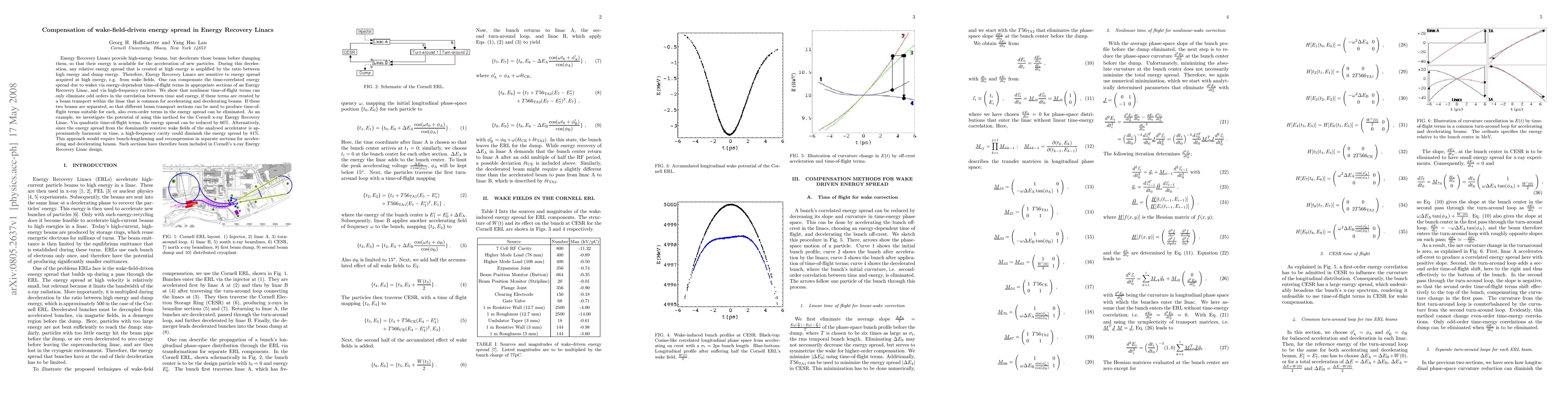 This paper discusses methods to compensate for energy spread in Energy Recovery Linacs caused by wake fields, showing that time-of-flight terms and high-frequency cavities can reduce this spread. For the Cornell x-ray Energy Recovery Linac, quadratic time-of-flight terms can reduce energy spread by 66%, while high-frequency cavities can achieve an 81% reduction.