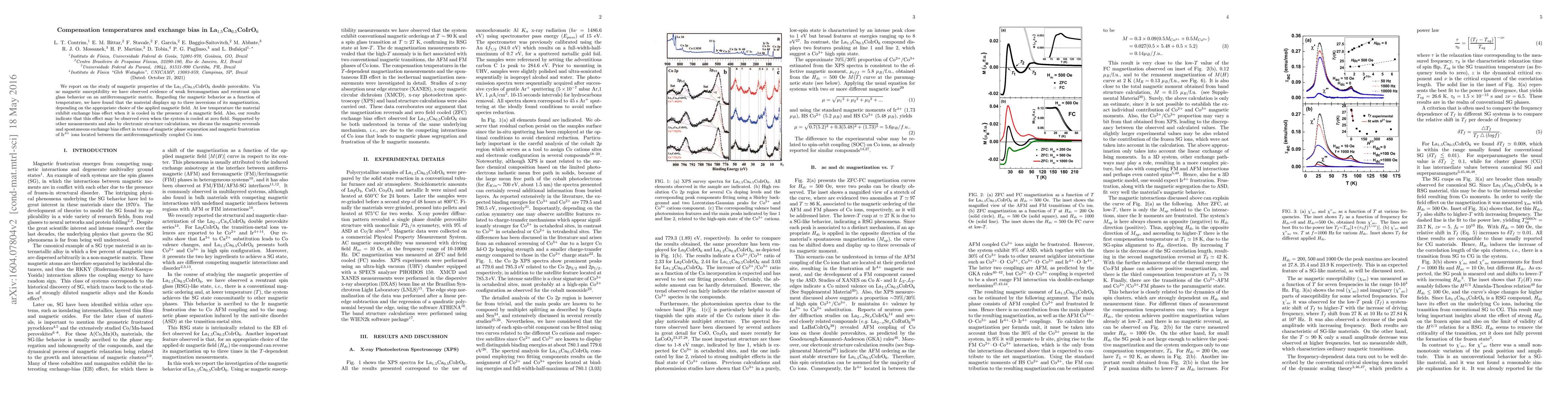 The research investigates La1.5Ca0.5CoIrO6, finding weak ferromagnetism, reentrant spin glass behavior, and up to three magnetization inversions with temperature changes. Exchange bias effect is observed at low temperatures, even without applied field, attributed to magnetic phase separation and frustration of Ir4+ ions between antiferromagnetically coupled Co ions.
