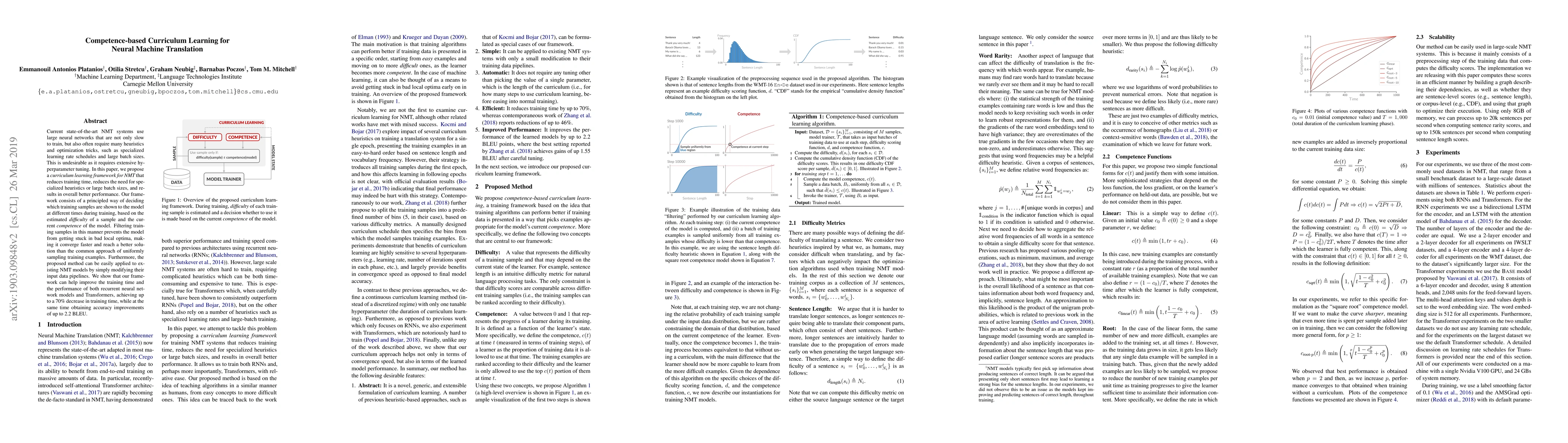 This paper proposes a competence-based curriculum learning framework for neural machine translation (NMT) that reduces training time and eliminates the need for specialized heuristics, leading to faster convergence and better performance. The method achieves up to a 70% decrease in training time and up to a 2.2 BLEU score improvement.