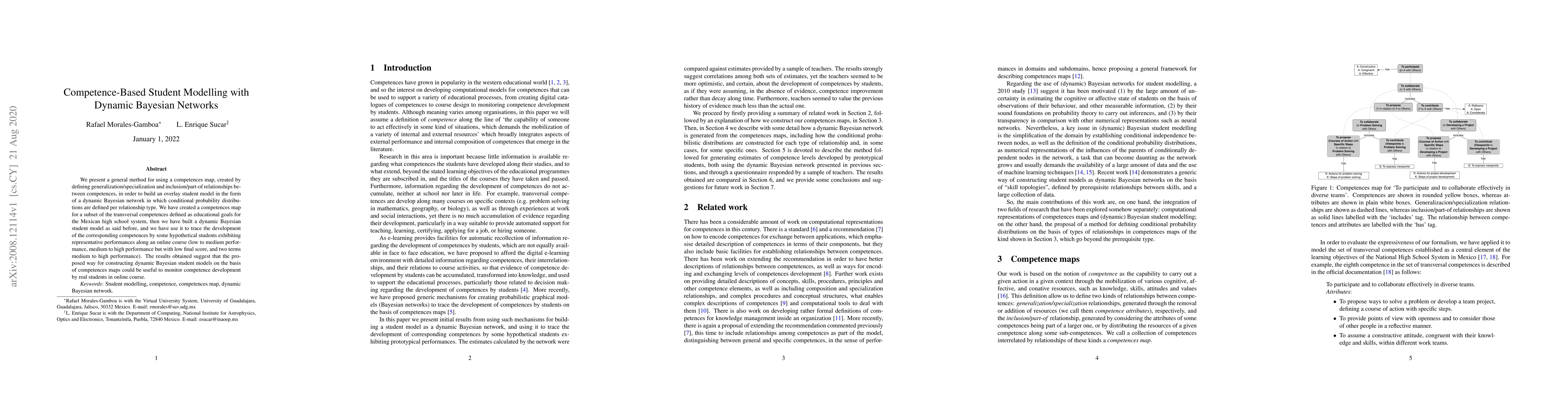We present a general method for using a competences map, created by defining generalization/specialization and inclusion/part-of relationships between competences, in order to build an overlay student model in the form of a dynamic Bayesian network in which conditional probability distributions are defined per relationship type. We have created a competences map for a subset of the transversal competences defined as educational goals for the Mexican high school system, then we have built a dynamic Bayesian student model as said before, and we have use it to trace the development of the corresponding competences by some hypothetical students exhibiting representative performances along an online course (low to medium performance, medium to high performance but with low final score, and two terms medium to high performance). The results obtained suggest that the proposed way for constructing dynamic Bayesian student models on the basis of competences maps could be useful to monitor competence development by real students in online course.