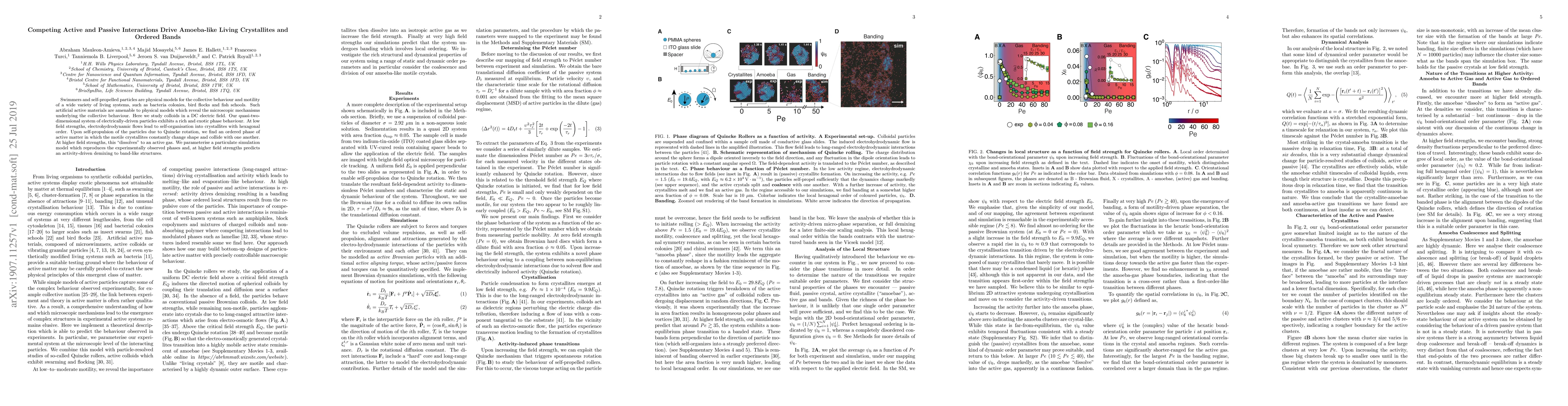 This research explores the collective behavior of electrically-driven colloidal particles in a DC electric field, revealing how competing active and passive interactions lead to self-organization into crystallites and ordered bands. The study identifies a transition from active motile crystallites to an active gas and predicts demixing to band-like structures at higher field strengths.