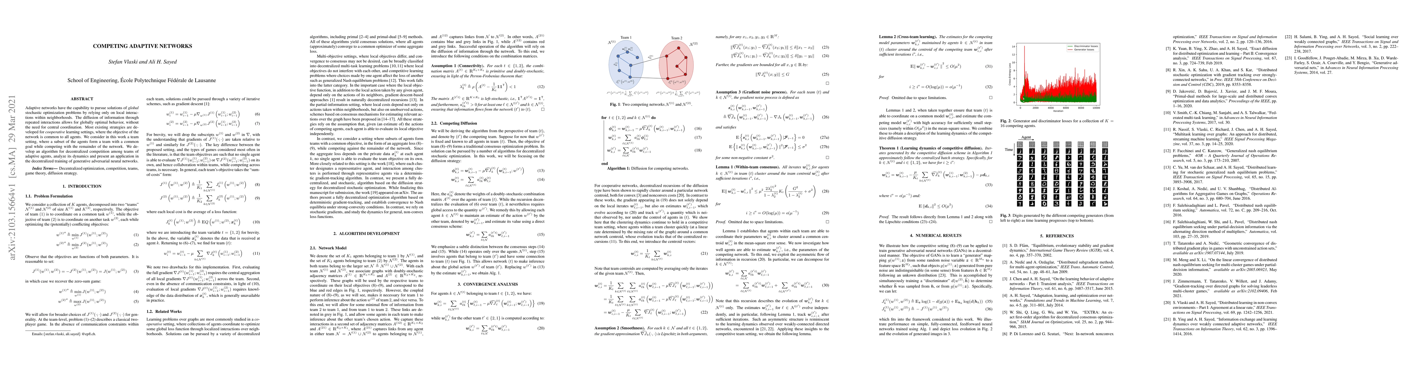 Adaptive networks have the capability to pursue solutions of global stochastic optimization problems by relying only on local interactions within neighborhoods. The diffusion of information through repeated interactions allows for globally optimal behavior, without the need for central coordination. Most existing strategies are developed for cooperative learning settings, where the objective of the network is common to all agents. We consider in this work a team setting, where a subset of the agents form a team with a common goal while competing with the remainder of the network. We develop an algorithm for decentralized competition among teams of adaptive agents, analyze its dynamics and present an application in the decentralized training of generative adversarial neural networks.