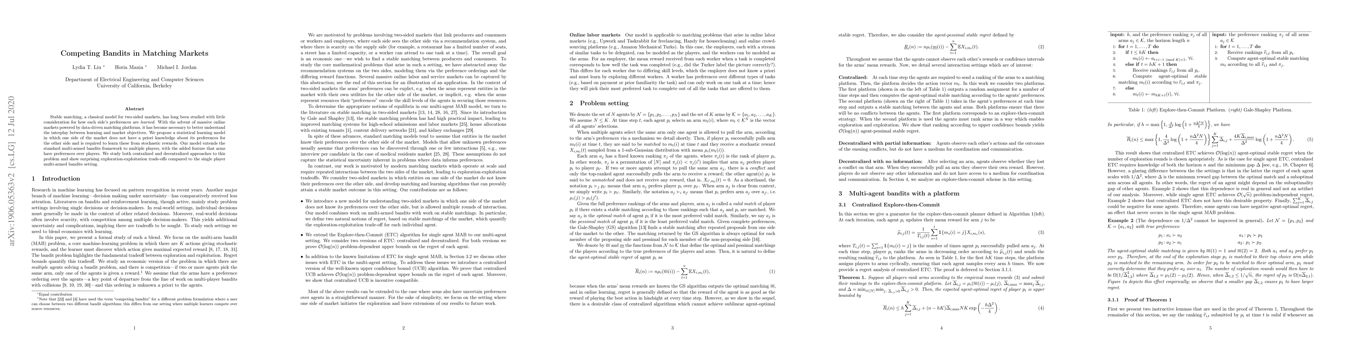 This paper proposes a statistical learning model for stable matching in two-sided markets where one side learns preferences from stochastic rewards, extending the multi-armed bandit framework to multiple players. It explores both centralized and decentralized approaches, revealing complex exploration-exploitation trade-offs.
