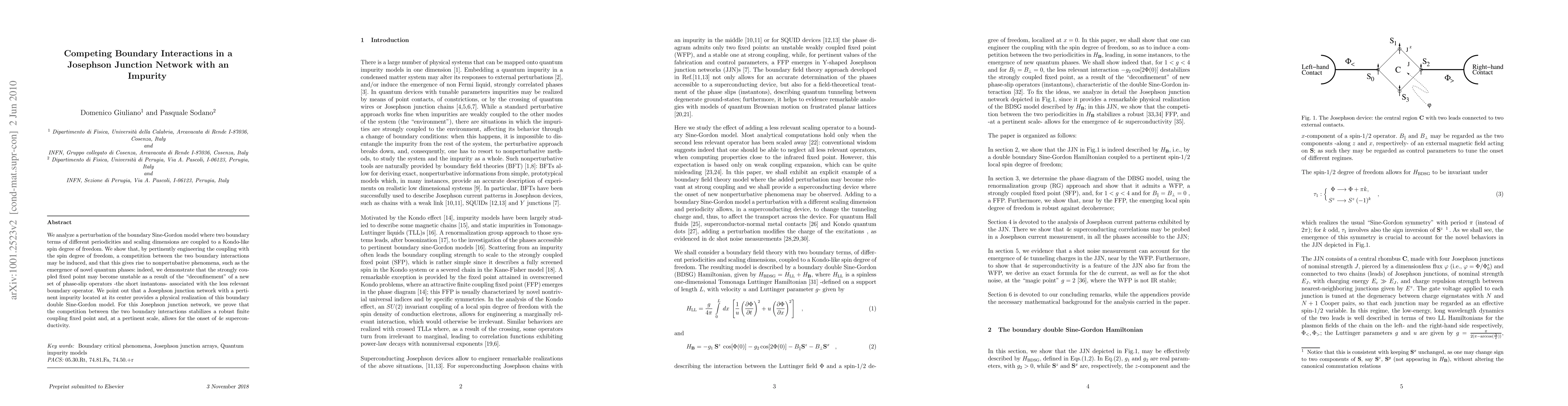 We analyze a perturbation of the boundary Sine-Gordon model where two boundary terms of different periodicities and scaling dimensions are coupled to a Kondo-like spin degree of freedom. We show that, by pertinently engineering the coupling with the spin degree of freedom, a competition between the two boundary interactions may be induced, and that this gives rise to nonpertubative phenomena, such as the emergence of novel quantum phases: indeed, we demonstrate that the strongly coupled fixed point may become unstable as a result of the "deconfinement" of a new set of phase-slip operators -the short instantons- associated with the less relevant boundary operator. We point out that a Josephson junction network with a pertinent impurity located at its center provides a physical realization of this boundary double Sine-Gordon model. For this Josephson junction network, we prove that the competition between the two boundary interactions stabilizes a robust finite coupling fixed point and, at a pertinent scale, allows for the onset of $4e$ superconductivity.