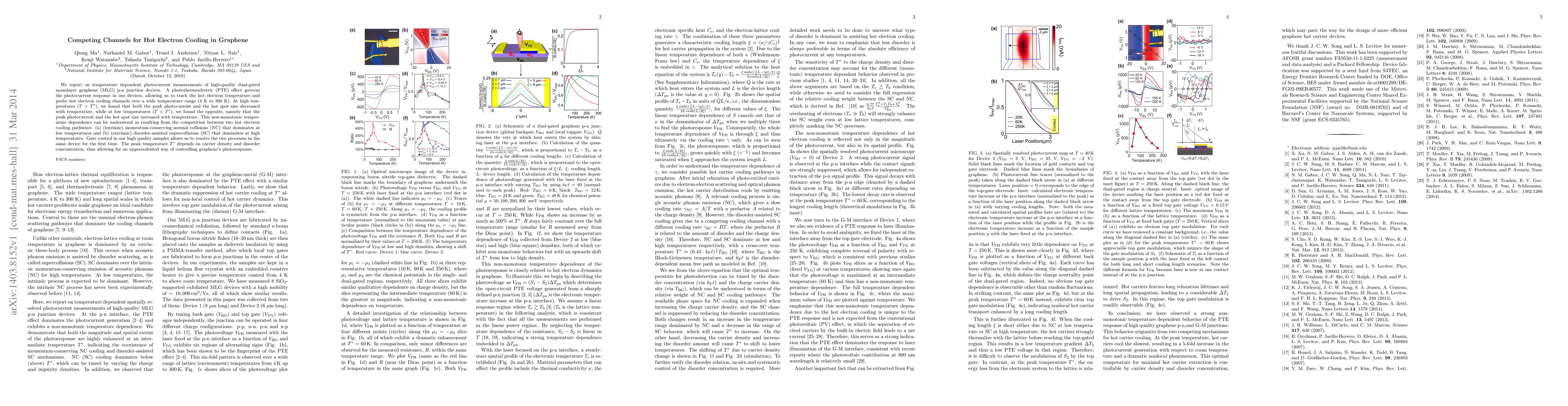 This paper investigates temperature-dependent photocurrent in graphene p-n junctions, revealing a PTE effect that tracks hot electron cooling. It identifies competing cooling mechanisms: intrinsic normal collisions at low temperatures and extrinsic supercollisions at high temperatures, with gate control enabling resolution of these processes in a single device.