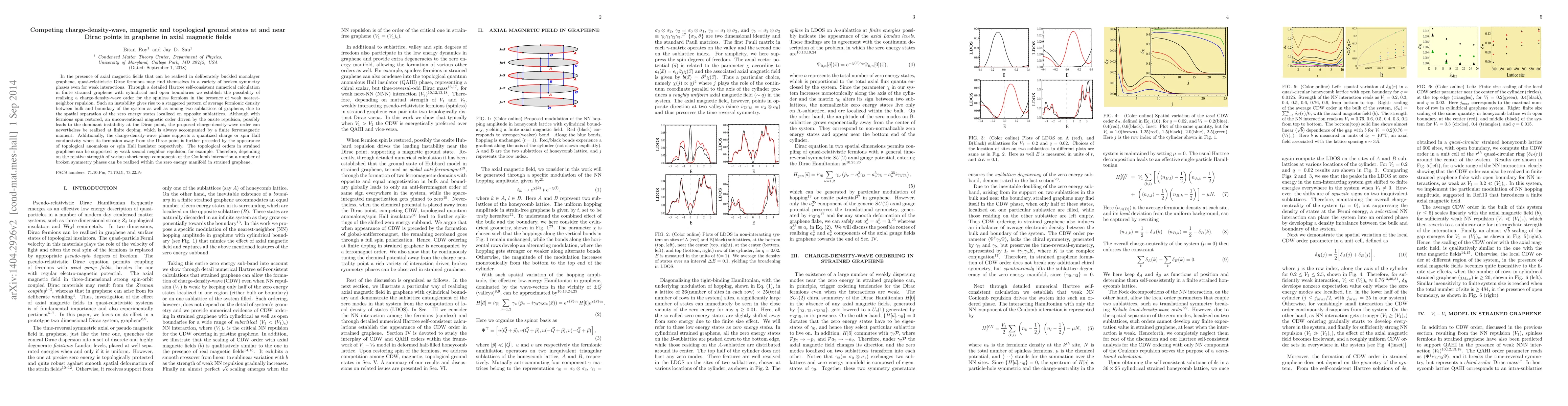 In the presence of axial magnetic fields that can be realized in deliberately buckled monolayer graphene, quasi-relativistic Dirac fermions may find themselves in a variety of broken symmetry phases even for weak interactions. Through a detailed Hartree self-consistent numerical calculation in finite strained graphene with cylindrical and open boundaries we establish the possibility of realizing a charge-density-wave order for the spinless fermions in the presence of weak nearest-neighbor repulsion. Such an instability gives rise to a staggered pattern of average fermionic density between bulk and boundary of the system as well as among two sublattices of graphene, due to the spatial separation of the zero energy states localized on opposite sublattices. Although with fermions spin restored, an unconventional magnetic order driven by the onsite repulsion, possibly leads to the dominant instability at the Dirac point, the proposed charge-density-wave order can nevertheless be realized at finite doping, which is always accompanied by a finite ferromagnetic moment. Additionally, the charge-density-wave phase supports a quantized charge or spin Hall conductivity when its formation away from the Dirac point is further preceded by the appearance of topological anomalous or spin Hall insulator respectively. The topological orders in strained graphene can be supported by weak second neighbor repulsion, for example. Therefore, depending on the relative strength of various short-range components of the Coulomb interaction a number of broken symmetry phases can be realized within the zero energy manifold in strained graphene.