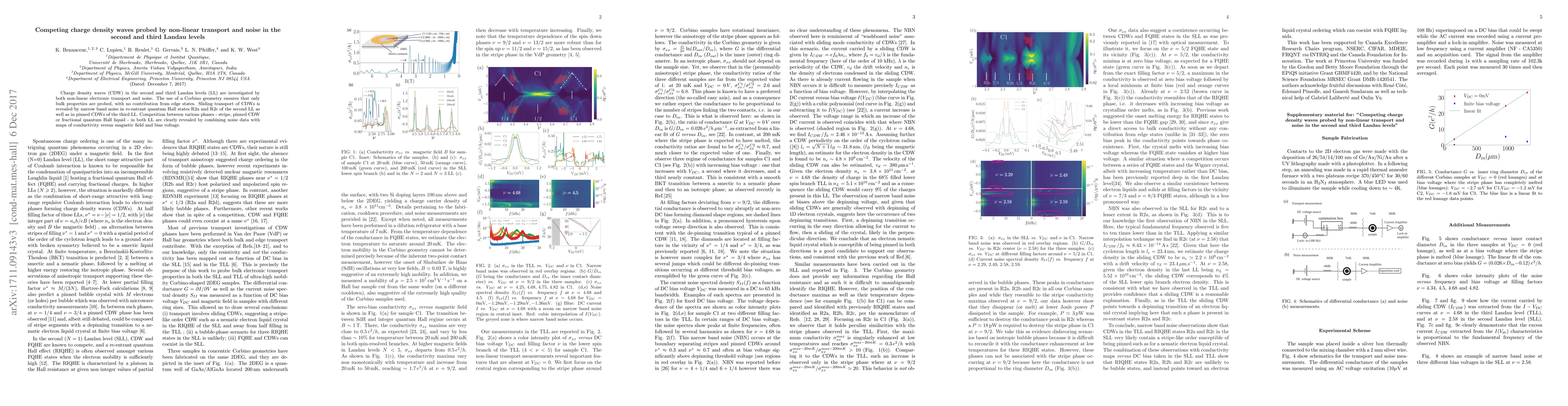 This paper investigates competing charge density waves in the second and third Landau levels using non-linear transport and noise measurements in a Corbino geometry. The study reveals sliding transport of CDWs through narrow band noise in quantum Hall states and highlights the interplay between different phases in the Landau levels.