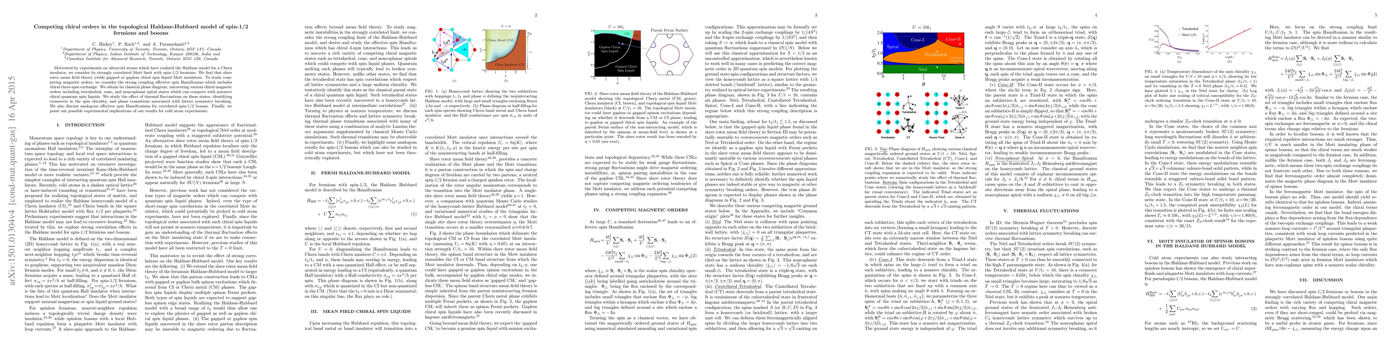 This paper explores the topological Haldane-Hubbard model in the Mott insulator regime for spin-1/2 fermions, revealing chiral spin liquid states and various competing chiral magnetic orders. It also investigates analogous phenomena in spin-1/2 bosons and discusses potential experimental implications for cold atom systems.