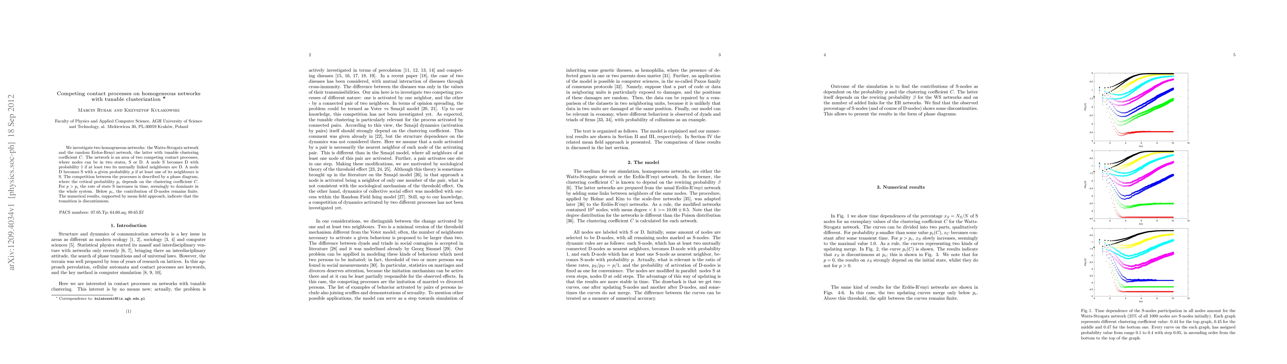 We investigate two homogeneous networks: the Watts-Strogatz network and the random Erdos-Renyi network, the latter with tunable clustering coefficient $C$. The network is an area of two competing contact processes, where nodes can be in two states, S or D. A node S becomes D with probability 1 if at least two its mutually linked neighbours are D. A node D becomes S with a given probability $p$ if at least one of its neighbours is S. The competition between the processes is described by a phase diagram, where the critical probability $p_c$ depends on the clustering coefficient $C$. For $p>p_c$ the rate of state S increases in time, seemingly to dominate in the whole system. Below $p_c$, the contribution of D-nodes remains finite. The numerical results, supported by mean field approach, indicate that the transition is discontinuous.