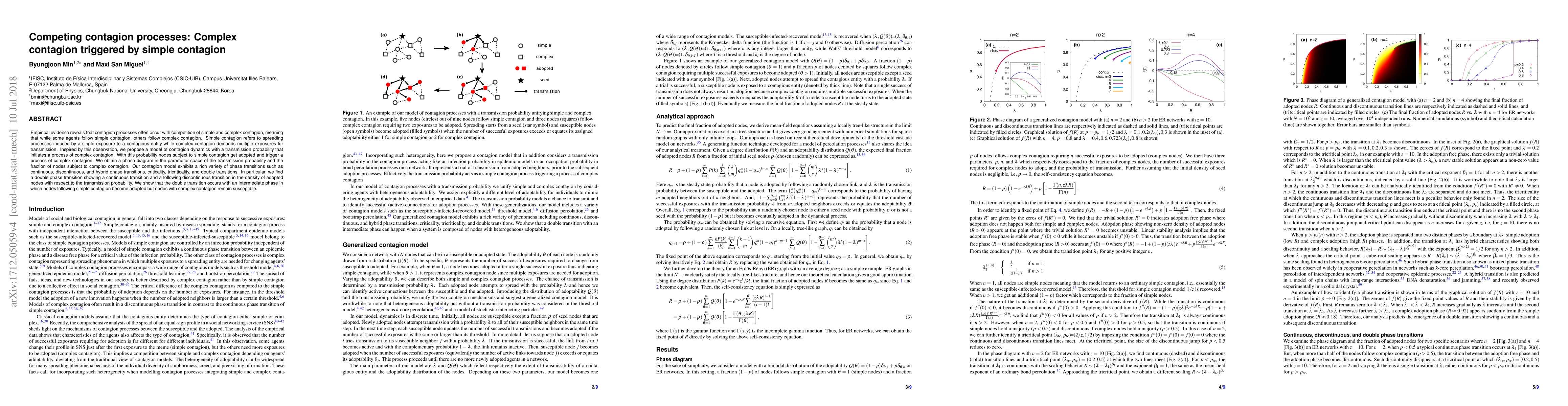 This paper proposes a model for competing contagion processes where simple contagion triggers complex contagion, leading to a variety of phase transitions including continuous, discontinuous, and hybrid transitions. The model reveals a double phase transition characterized by an intermediate phase where simple contagion adoption occurs without affecting complex contagion susceptibility.