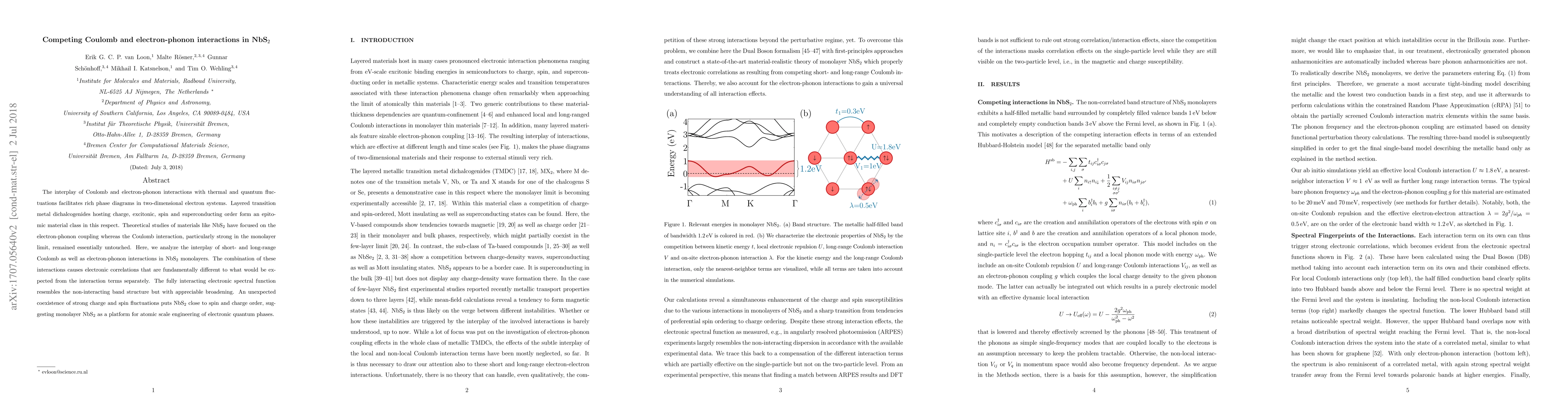 The interplay of Coulomb and electron-phonon interactions with thermal and quantum fluctuations facilitates rich phase diagrams in two-dimensional electron systems. Layered transition metal dichalcogenides hosting charge, excitonic, spin and superconducting order form an epitomic material class in this respect. Theoretical studies of materials like NbS$_2$ have focused on the electron-phonon coupling whereas the Coulomb interaction, particularly strong in the monolayer limit, remained essentially untouched. Here, we analyze the interplay of short- and long-range Coulomb as well as electron-phonon interactions in NbS$_2$ monolayers. The combination of these interactions causes electronic correlations that are fundamentally different to what would be expected from the interaction terms separately. The fully interacting electronic spectral function resembles the non-interacting band structure but with appreciable broadening. An unexpected coexistence of strong charge and spin fluctuations puts NbS$_2$ close to spin and charge order, suggesting monolayer NbS$_2$ as a platform for atomic scale engineering of electronic quantum phases.