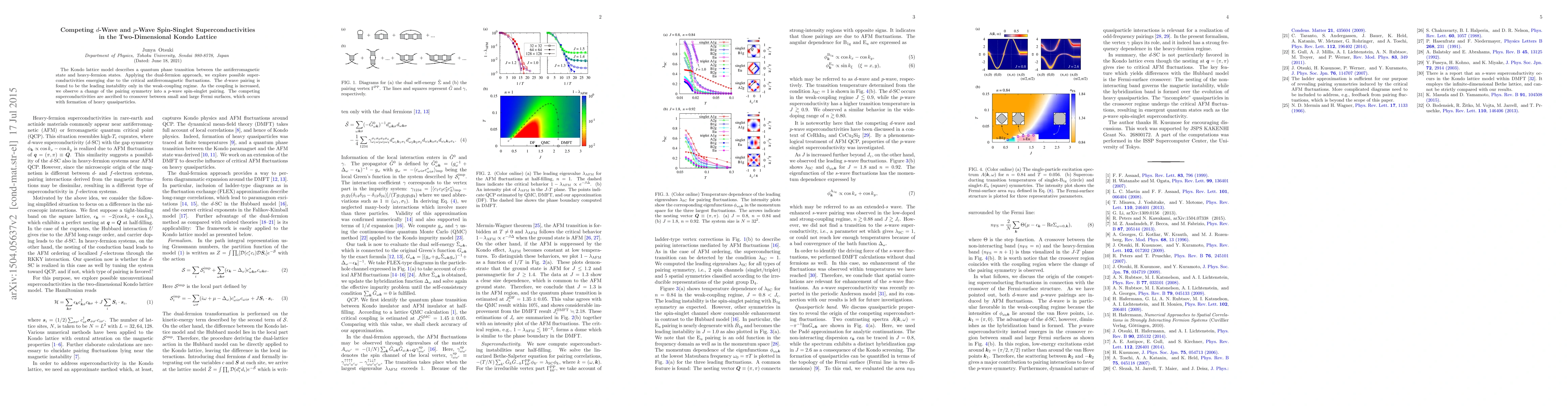 Researchers find that superconductivity in a Kondo lattice model can switch between d-wave and p-wave spin-singlet pairing as the coupling strength increases, driven by changes in Fermi surface size.