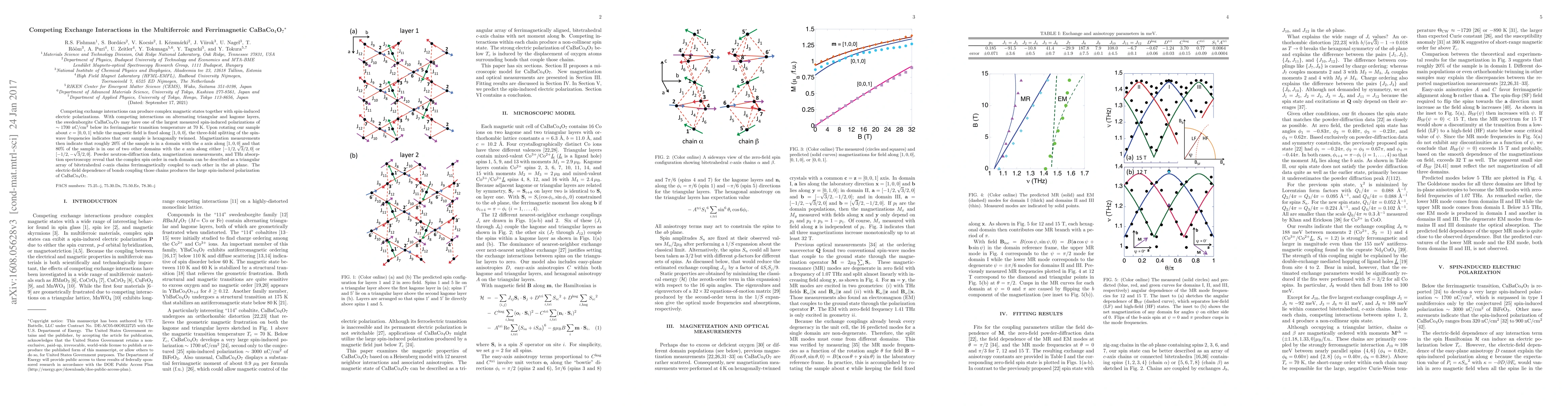 Competing exchange interactions can produce complex magnetic states together with spin-induced electric polarizations. With competing interactions on alternating triangular and kagome layers, the swedenborgite CBO may have one of the largest measured spin-induced polarizations of about 1700 nC/cm$^2$ below its ferrimagnetic transition temperature at 70 K. Powder neutron-diffraction data, magnetization measurements, and spin-wave resonance frequencies in the THz range reveal that the complex spin order of multiferroic CBO can be described as a triangular array of c-axis chains ferrimagnetically coupled to each other in the ab plane. Magnetostriction on bonds that couple those chains produces the large spin-induced polarization of CBO.