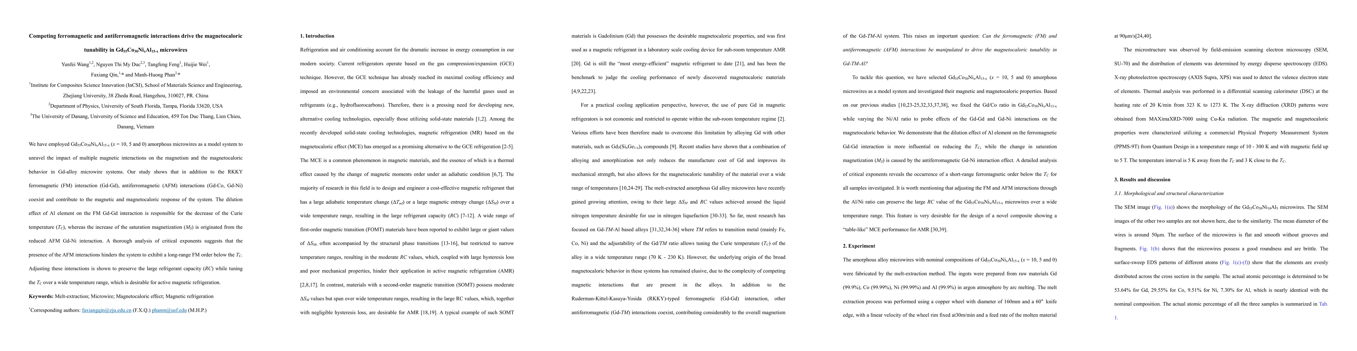 Gd55Co30NixAl15-x microwires exhibit magnetocaloric tunability driven by competing ferromagnetic and antiferromagnetic interactions. Adjusting these interactions can preserve large refrigerant capacity while tuning the Curie temperature over a wide range.