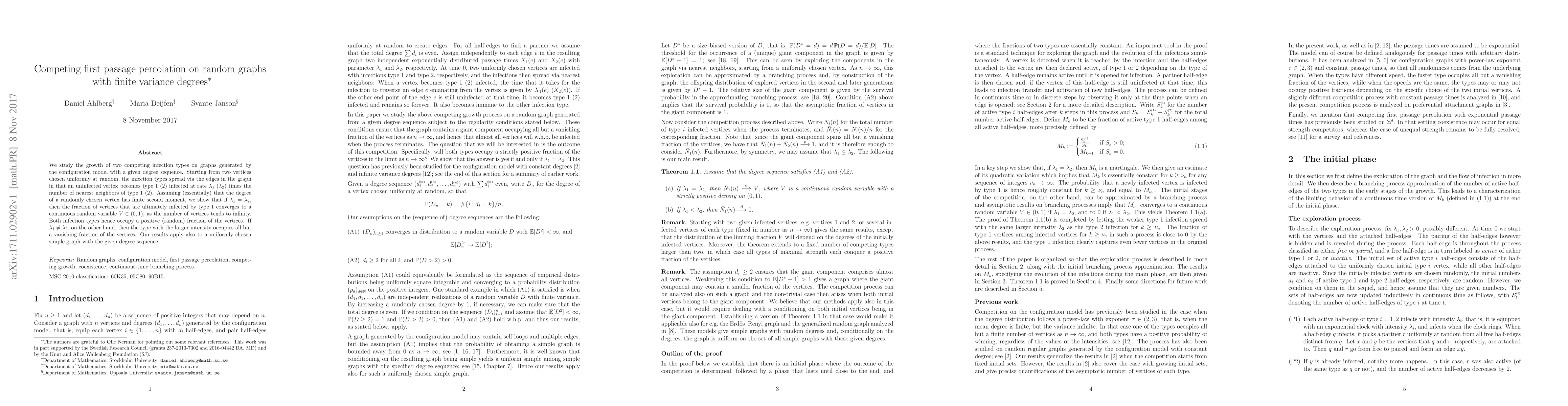 Two competing infection types on random graphs converge to occupy a positive fraction of vertices when intensities are equal, but one type dominates the other when intensities differ.